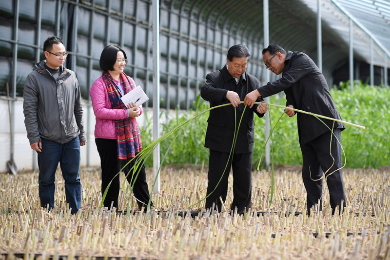 在宁夏银川市永宁县闽宁镇,福建农林大学教授林占熺(右二)与农户交流菌草种植技术(2021年3月29日摄)。新华社记者 王鹏 摄