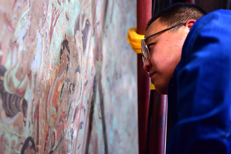 在莫高窟第231窟,敦煌研究院文物保护技术服务中心的壁画修复工作者在修复出现病害的壁画(2022年4月19日摄)。新华社记者 杜哲宇 摄