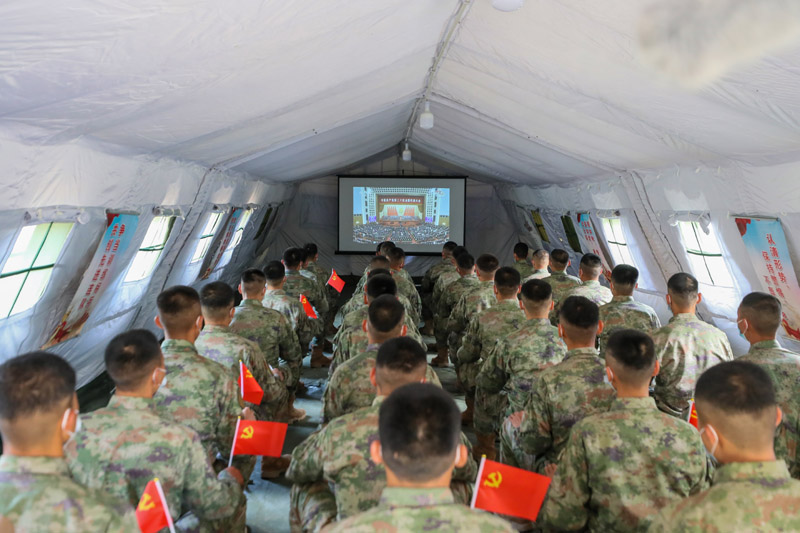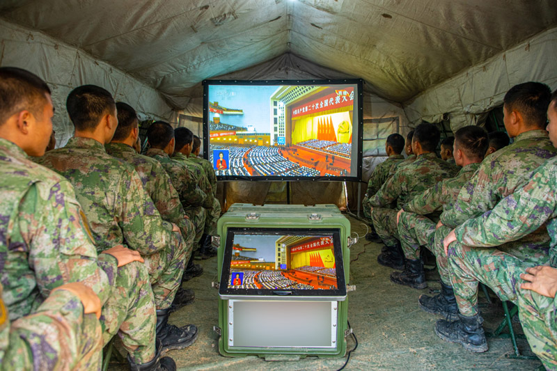 10月16日,中部战区陆军第82集团军某旅官兵收看中国共产党第二十次全国代表大会开幕会。新华社发(徐超 摄)