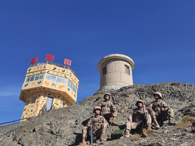 10月16日,新疆军区苏海图哨所官兵利用广播收听中国共产党第二十次全国代表大会开幕会。新华社发(何凯航 摄)
