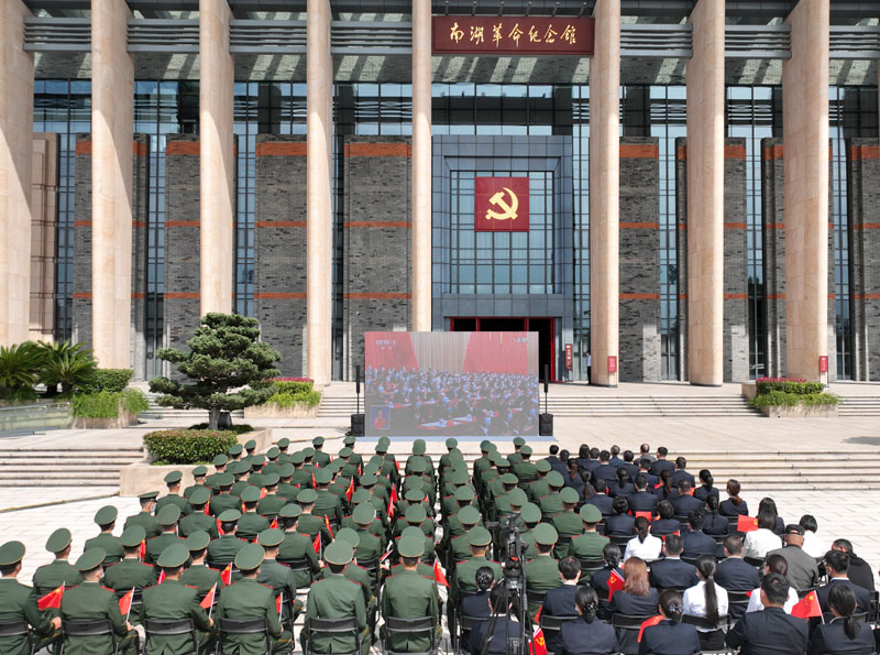 10月16日,武警嘉兴支队官兵在南湖革命纪念馆前与工作人员一起收看中国共产党第二十次全国代表大会开幕会(无人机照片)。新华社发(袁铭宏 摄)