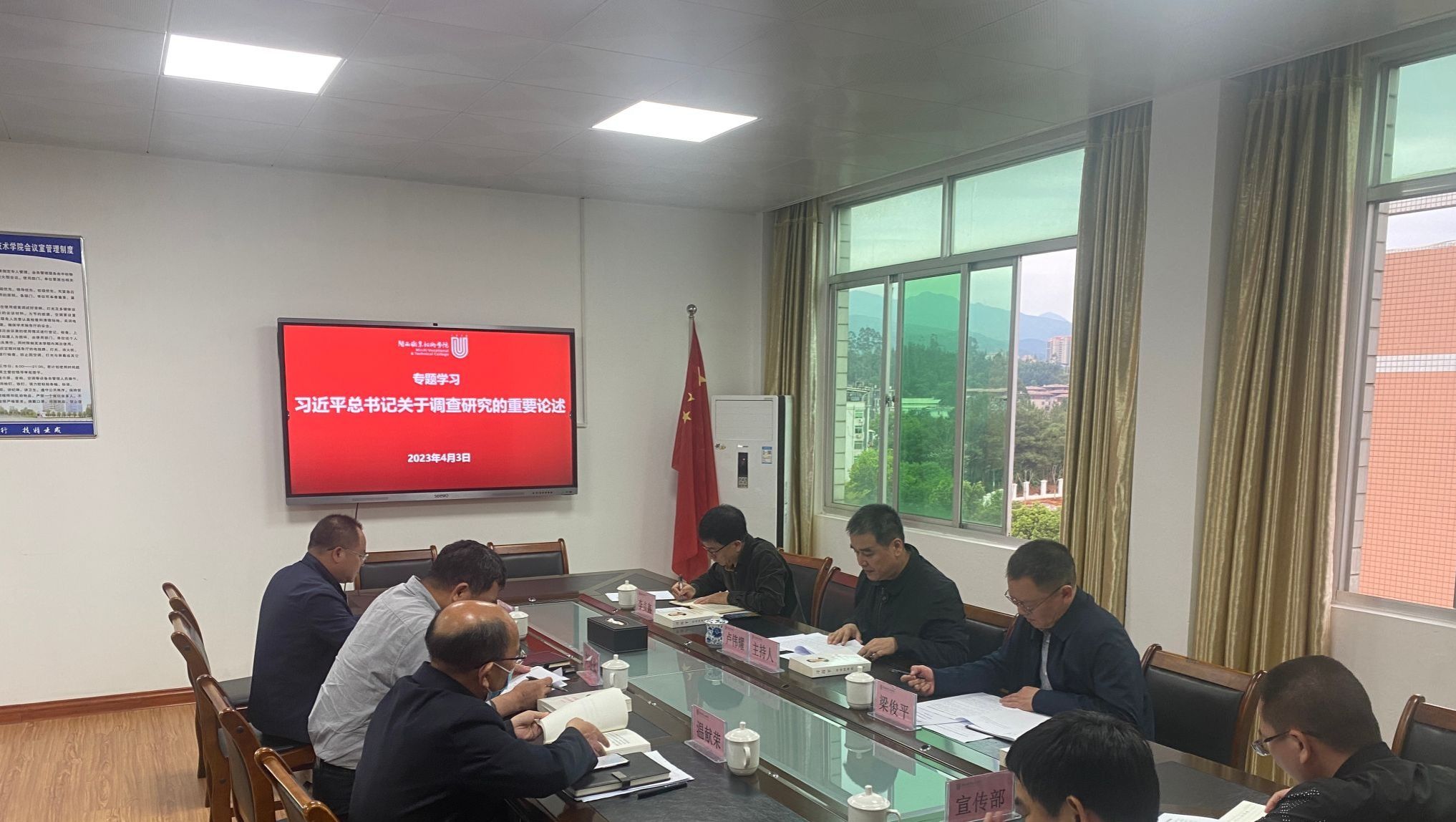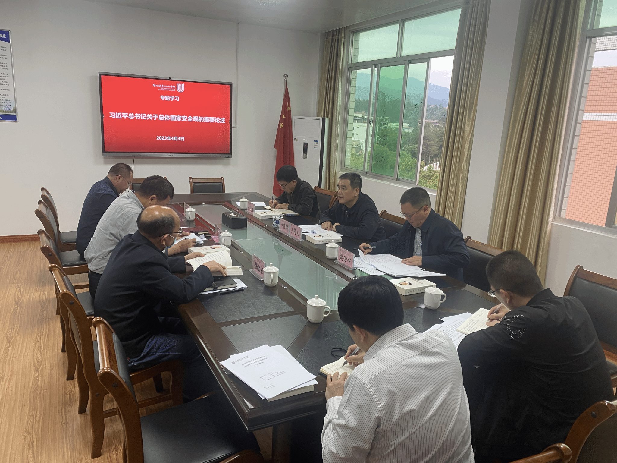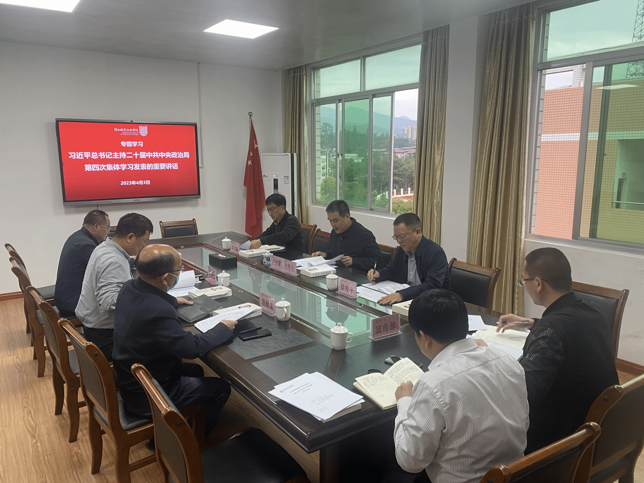 4月3日下午,校党委理论学习中心组2023年第五次学习会在六楼会议室召开,学习会围绕习近平总书记主持二十届中共中央政治局第四次集体学习发表的重要讲话,围绕习近平总书记关于调查研究的重要论述,围绕习近平总书记关于总体国家安全观的重要论述,进行集中学习研讨。校党委书记卢伟耀主持学习会,校党委委员、副校长刘路永作“牢固树立和践行总体国家安全观 谱写新时代平安校园建设新篇章”专题发言,中心组成员围绕学习内容进行讨论交流。