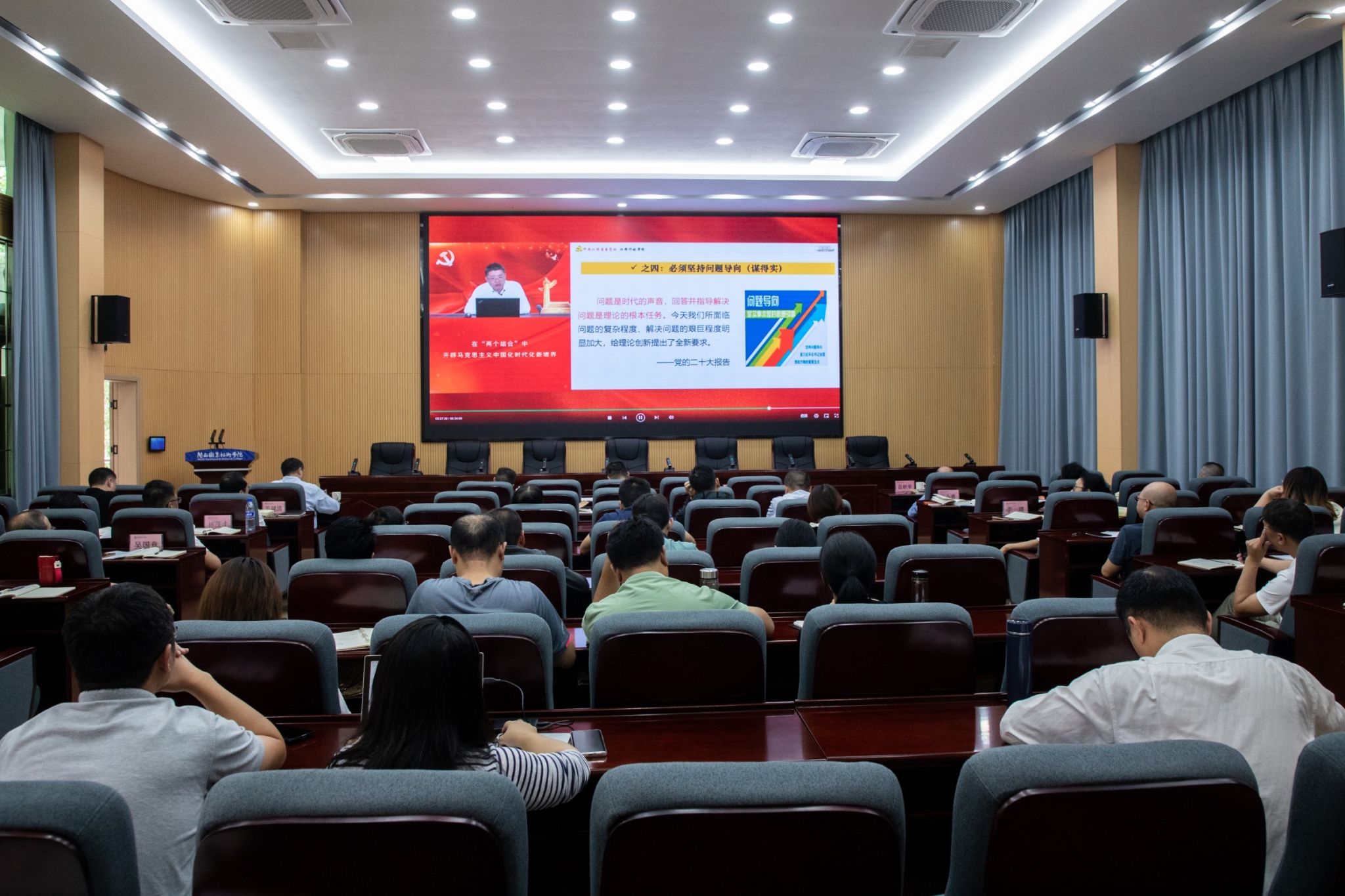 在专题辅导中学深悟透强思想。梁俊平校长领学《论党的自我革命》,全体学员认真学习《论党的自我革命》《树立和践行正确政绩观》《正确理解和大力推进中国式现代化》等系列专题,认真收看《如何理解宣传思想文化工作是一项极端重要的工作》《教育科技人才是全面建设社会主义现代化国家的基础性战略性支撑》等微党课,推动理论学习入脑入心、见行见效。