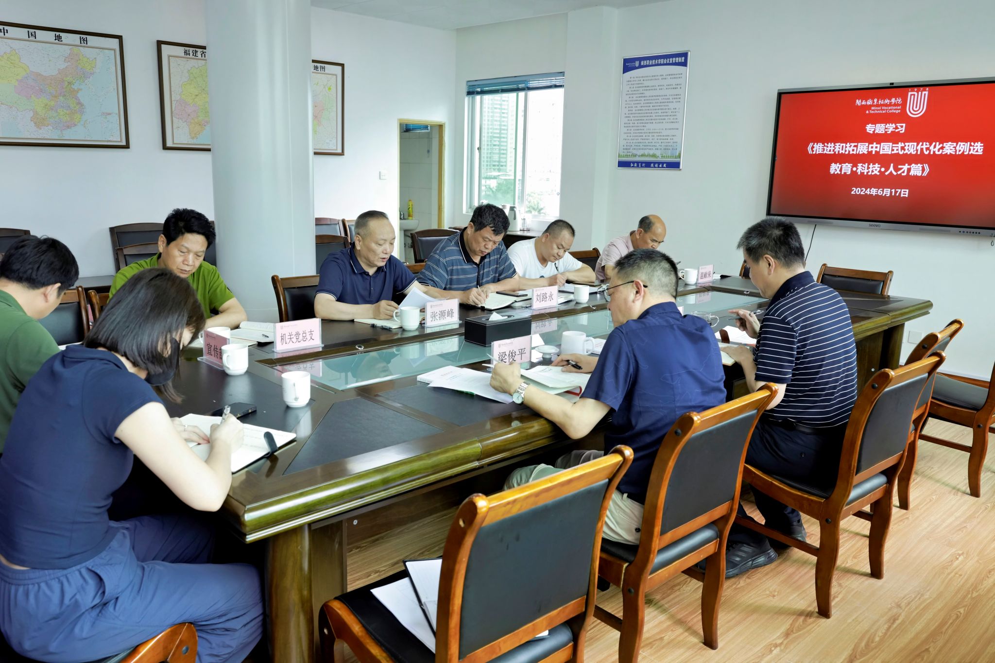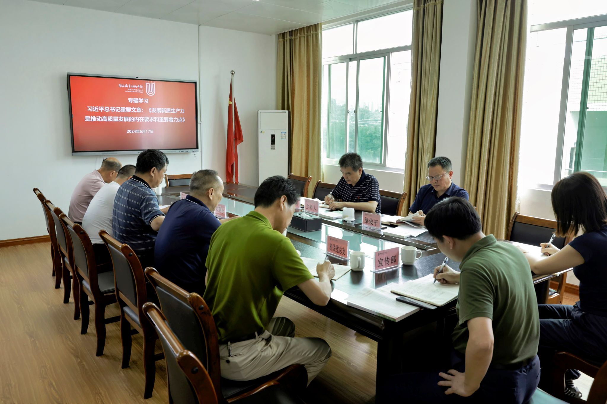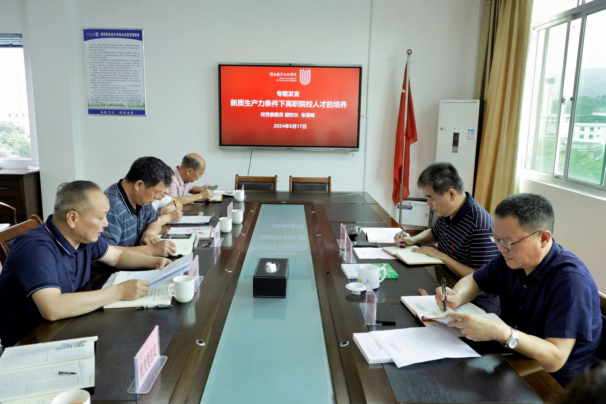 6月17日上午,校党委理论学习中心组2024年第八次学习会在六楼会议室召开,学习会认真学习习近平总书记在中共中央政治局第十四次集体学习时发表的重要讲话精神,认真学习习近平总书记重要文章:《发展新质生产力是推动高质量发展的内在要求和重要着力点》,专题学习研讨习近平总书记关于全面加强党的纪律建设重要论述,专题学习《推进和拓展中国式现代化案例选 教育·科技·人才篇》。校党委书记卢伟耀主持学习会,校党委委员、副校长张源峰作专题发言,中心组成员围绕学习内容进行讨论交流。