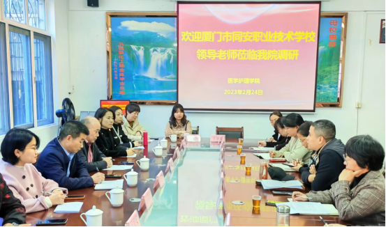 2月24日上午,厦门市同安职业技术学校党委副书记、教学副校长颜伟警一行莅临我校医护学院调研交流,在院党政领导陪同下到天马校区医学实训中心参观交流。双方在医护学院办公楼101会议室举行座谈交流会,院党政领导、各专业负责人参加了座谈交流。