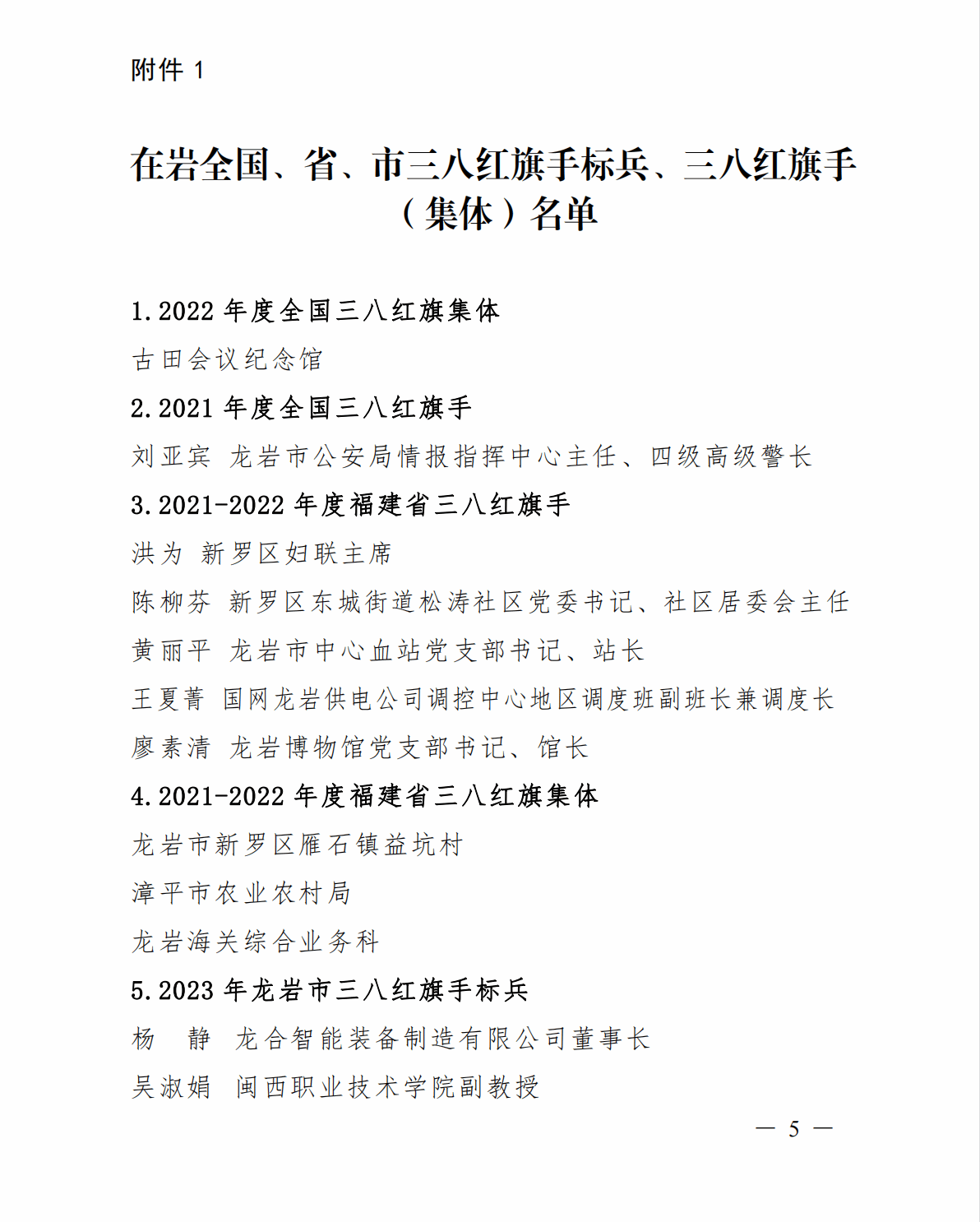3月2日,龙岩市妇联下发《龙岩市妇联关于举办“跟党奋进新征程 闽西巾帼竞风采”─龙岩市三八红旗手标兵、三八红旗手(集体)表扬通报活动的通知》(岩妇〔2023〕17 号),表彰在各行各业竞展风流、尽显风采,为加快建设闽西革命老区高质量发展示范区,奋力谱写全面建设社会主义现代化国家龙岩篇章贡献巾帼力量。我校吴淑娟老师荣获2023年龙岩市三八红旗手标兵荣誉。