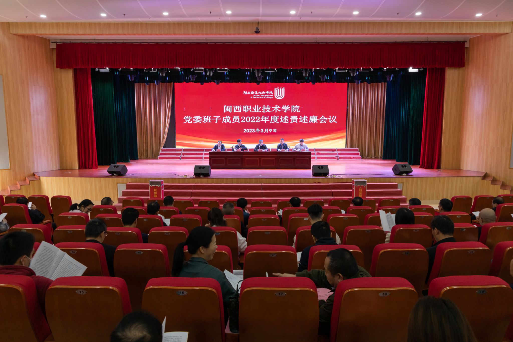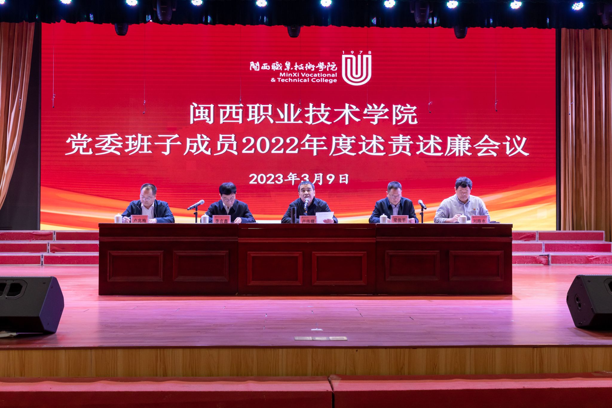 3月9日,校党委班子成员2022年度述责述廉会议在大匠堂召开,校党委书记卢伟耀主持会议,校党委委员出席会议。