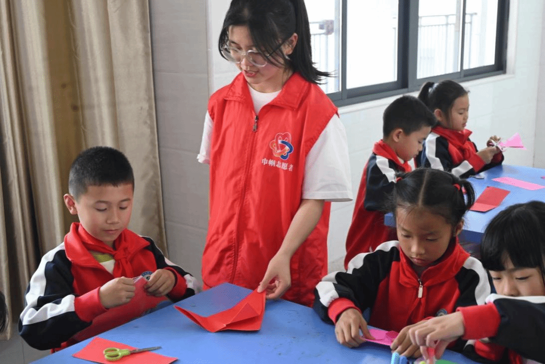 绘本讲解后,老师让小学生们将想对自己所爱的人说的话写进信中,封进由老师指导,学生亲手制作的信封中,以此来引导他们体验动手动脑的乐趣。志愿者们活跃于课堂中,协助老师不断指导学生们进行手工制作,为他们答疑解惑。折完信封已经临近下课,学生们举起心爱的信封进行展示,一个个喜上眉梢,喜笑颜开,并于下课后,与老师和志愿者们到国旗下合影留念。