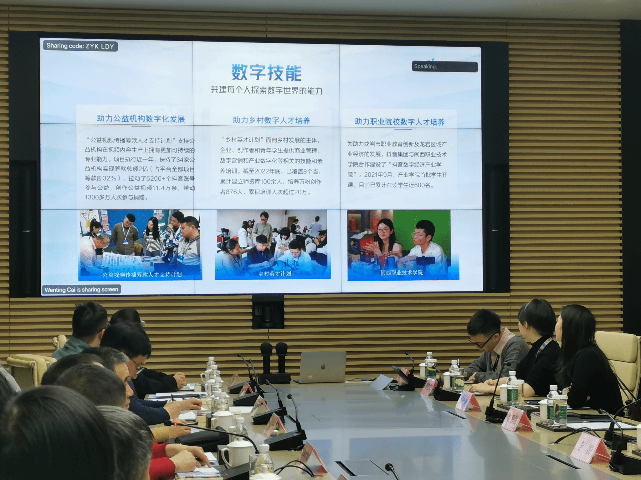 在抖音集团公司总部,学习交流团一行在抖音集团公司副总裁李涛的陪同下参观了抖音集团方恒展厅,看展示、听讲解、进行互动体验,详细了解了抖音集团的发展历程、正在运营的飞书、剪映等互联网产品,抖音数字学堂和乡村英才计划等项目。座谈会上,李涛副总裁详细介绍了抖音集团的发展愿景,财经商贸学院院长郭玲娜、抖音集团企业社会责任部院校产品总监蔡文婷作为抖音数字经济产业学院的校、企两方的代表分别就产业学院建设思路、建设进展以及总体规划向与会人员做了详细的介绍。校党委书记卢伟耀指出,抖音数字经济产业学院项目实施以来,在顶层机制设计、课程试点改革、育人模式升级等各方面都取得新突破、成果喜人,希望双方通过此次交流,持续深化合作关系,将抖音“平台赋能型”合作模式拓展到学校各个二级学院、抖音元素融入到校园的方方面面,从而真正实现“校企融合、坦诚相待、携手向未来”的美好愿景,培养出“身心健康、人格独立、发展有特色”现代阳光工匠;校长梁俊平表示,通过这次交流,对抖音集团产生了新的认知、对抖音数字经济产业学院有了新的定位,未来校企双方应持续深入开展合作,携手打造人才培养模式新样板,共同拓展产教融合新领域,助力学校实现高质量发展。