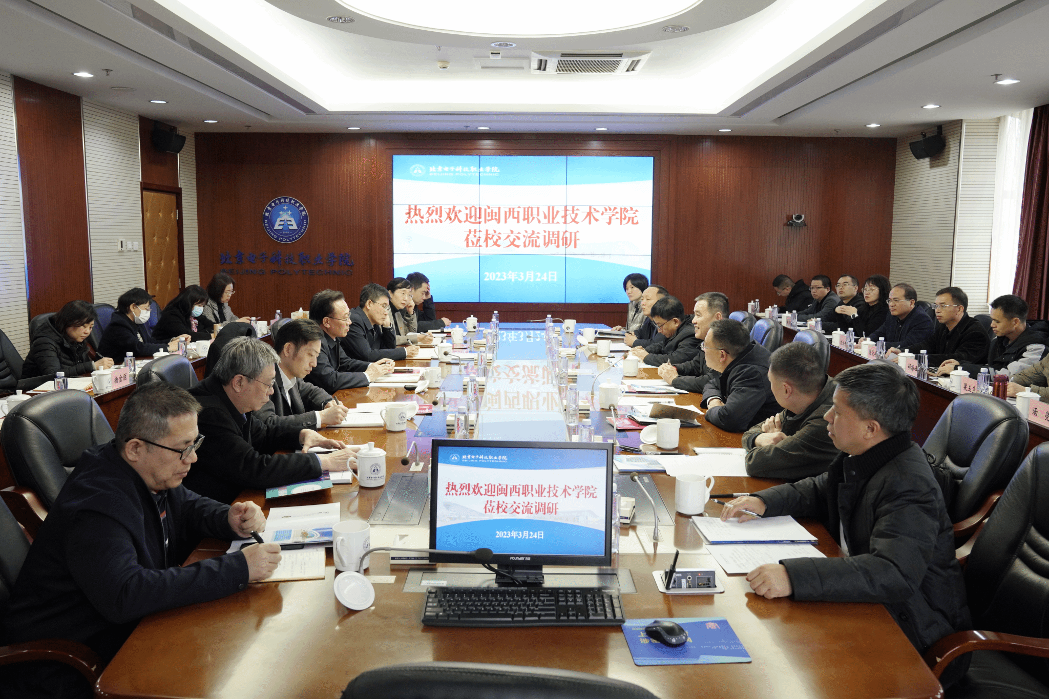 在北京电子科技职业学院,一行人参观了机电工程学院、汽车工程学院、电信工程学院、生物工程学院、艺术设计学院,详细了解了智能制造基地生产车间、集成电路中试基地、化药制剂与蛋白药物研发中试基地等各类专业化产教融合实训基地和应用技术协同创新中心的建设及运行情况,北京电子科技职业学院校长姚光业、副校长朱运利及各相关职能部门负责人随同参观并做了介绍。在座谈会上,北京电子科技职业学院校长姚光业对学习交流团一行的到来表示热烈欢迎,介绍了该校办学成效和办学特色,他希望两校今后进一步加强沟通交流,相互学习,相互借鉴;校党委书记卢伟耀对北京电子科技职业学院的热情接待表示感谢,他指出,近年来北京电子科技职业学院各项事业得到快速发展,各项成果令人印象深刻,成为开发区里办高职的典型样板及国家“双高校”建设的标杆,值得我校认真学习和借鉴,也真诚欢迎北京电子科技职业学院同仁来龙岩传经送宝,同时也接受革命老区的思想洗礼,携手实现高质量发展;校长梁俊平表示,北京电子科技职业学院办学成就显著、成果丰硕,已成为全国高职院校的领跑者和发展样板,希望两校未来能建立起良好的交流合作机制。会后,学习交流团各成员深入到北京电子科技职业学院的对口部门、学院实地参观并深入交流。