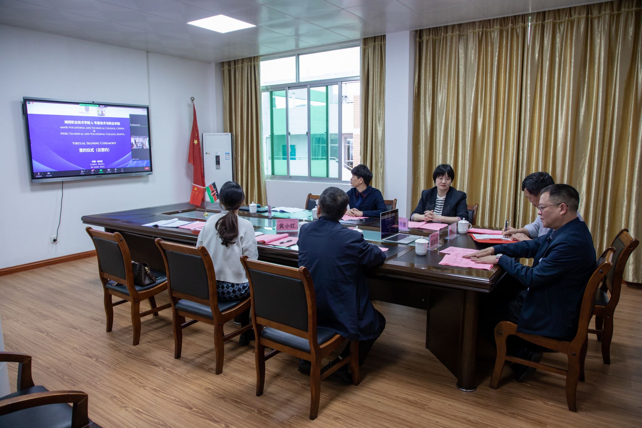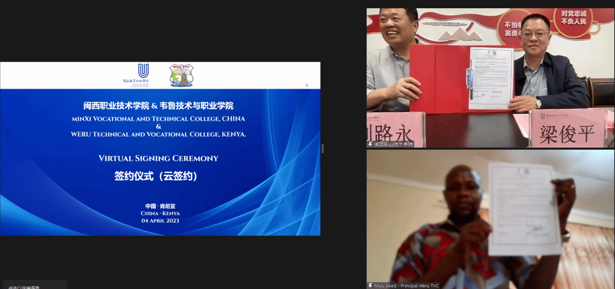 2023年4月4日,学校与肯尼亚韦鲁技术和职业学院(WERU Technical and Vocational College)举行校际合作“云”签约暨“中文+职业技能”培训班开班仪式。校长梁俊平、副校长刘路永以及对外交流合作处、科研处、学生工作处等职能部门负责人,肯尼亚书记官/项目协调员内维尔-巴拉萨先生,韦鲁技术与职业学院校长阿贝德尼戈-穆鲁先生、副校长安德鲁-莫戈亚先生、玛格丽特-姆瓦林加夫人及各相关部门负责人,马来西亚国际文化交流中心总经理吕慧恩女士、中国区总经理周晋等出席仪式。