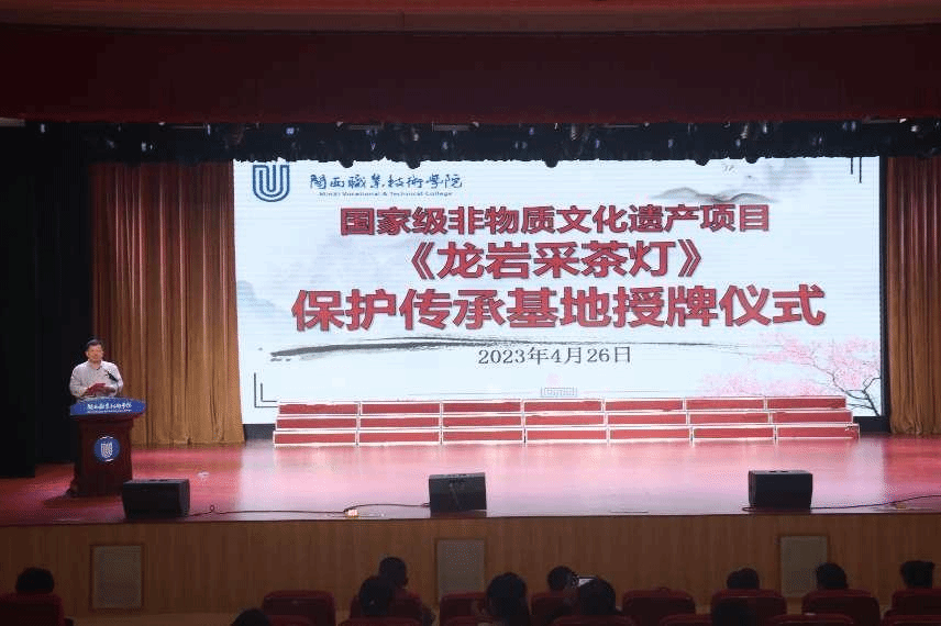刘路永副校长在仪式上致辞,他表示,全体师生将自觉扛起弘扬和传承中华优秀传统文化这份神圣的历史使命,一如既往地做好非物质文化遗产保护传承工作。深入开展采茶灯文化研究活动,挖掘采茶灯艺术的研究价值;在传承人的指导下开展采茶灯学习交流活动,推动采茶灯艺术向广度和深度传承发展;利用现代融媒体力量,全方位多角度地宣传采茶灯传承发展情况,为保护传承闽西优秀传统文化增添一份力量。