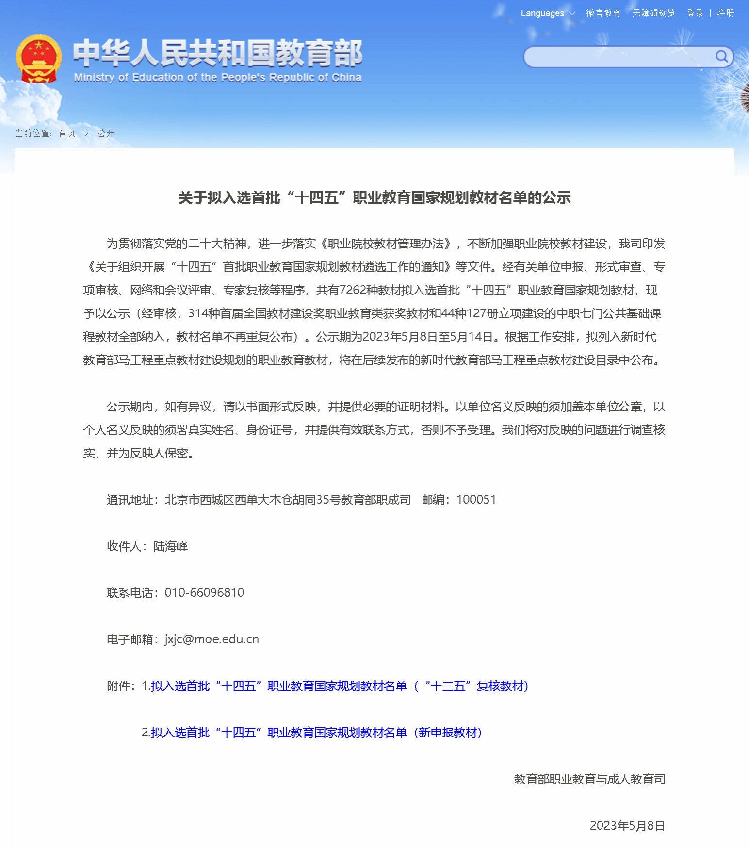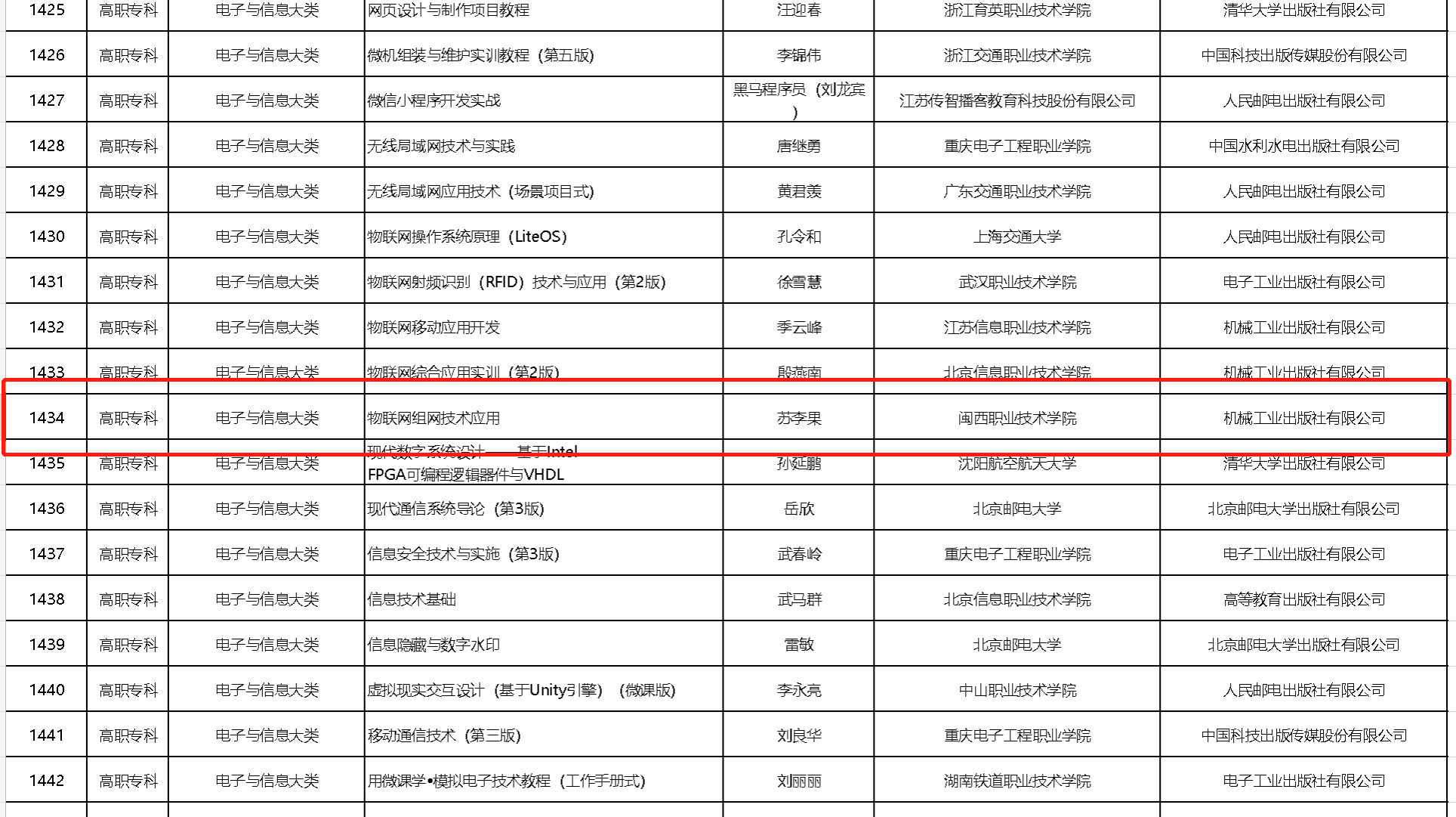 近日,教育部发布了《关于拟入选“十四五”职业教育国家规划教材名单的公示》,我校信息工程学院苏李果老师主编的《物联网组网技术应用》教材拟入选为“十四五”职业教育国家规划教材名单,为我校首门入选教材。