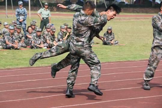 表演仪式上,各系选派一个代表队进行队列训练表演,同学们以整齐的队形、矫健的步伐、蓬勃的朝气、嘹亮的口号和高昂的热情向在场师生展示了他们军训的丰硕成果和当代大学生的青春风采。教官代表队表演擒敌术,动作干练、招式娴熟,气势恢宏、铿锵有力,一招一式尽显英雄本色,军人英姿赢得了阵阵雷鸣般的掌声。2017级新生大型团体操表演,将整个汇报表演推向高潮。