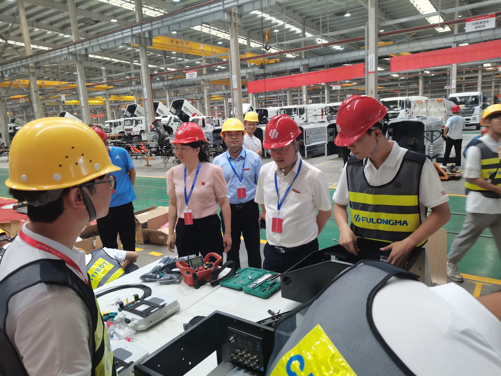 在福龙马环卫装备产业学院,调研组一行参观了生产车间,看望了在企业进行校企双元育人培养的“智慧环卫服务运营和智慧环境管控平台专班”学生们,勉励他们安心实践,踏实工作。
