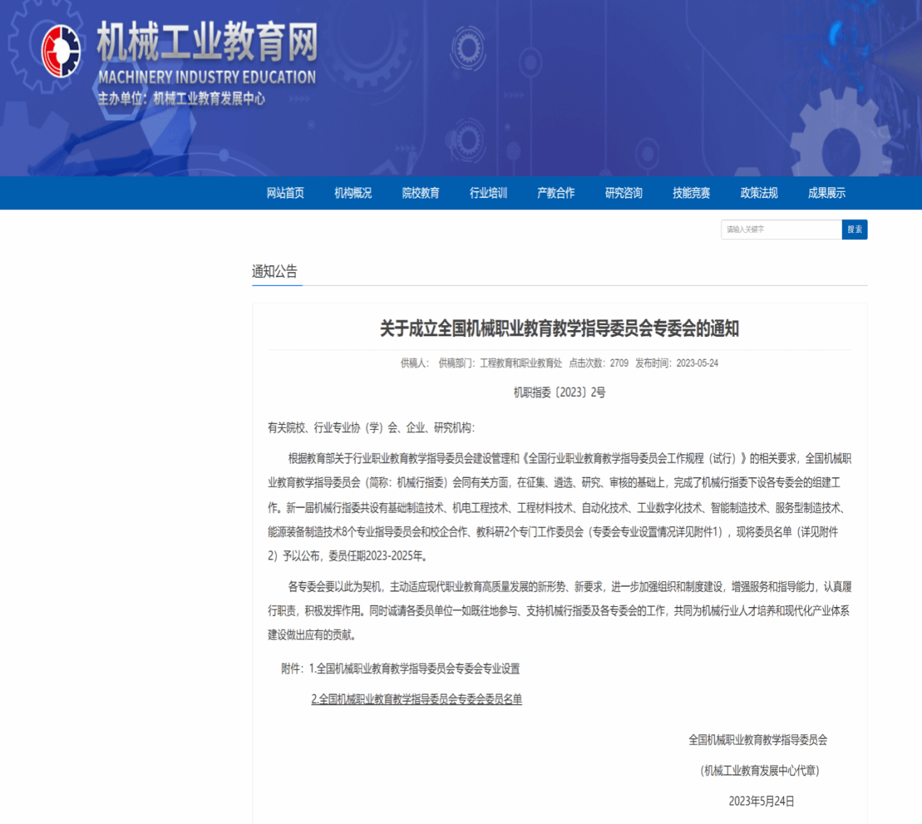 全国机械职业教育教学指导委员会由教育部批准成立,机械工业教育发展中心牵头组建和管理,面向全国机械行业职业教育进行研究、指导、咨询、服务和评价的专家组织,其成员主动适应国家加快发展现代职业教育和实施制造强国战略的新形势,共同为机械行业创新人才培养和实现《中国制造2025》战略目标作出应有的贡献。