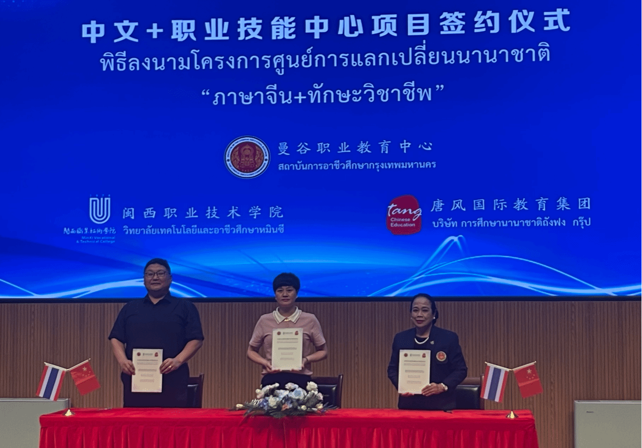 会上,我校与泰国教育部职业教育委员会曼谷职业教育中心、北京唐风国际教育集团签订“中文+职业技能”战略合作协议,此举是我校积极开展国际交流合作工作、拓展学校国际影响力的具体举措,为下一步深入参与中泰职业教育国际合作项目、输出职业教育“闽西模式”、服务本土“走出去”企业和国家“一带一路”倡议打下基础。