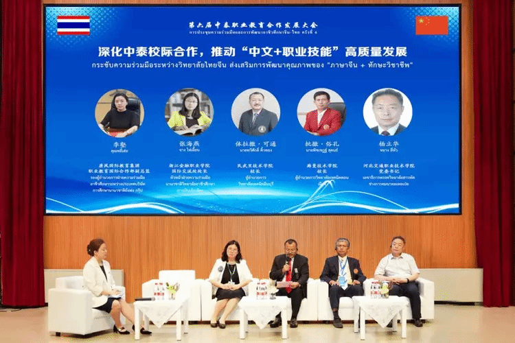 2023年6月8日,第六届中泰职业教育合作发展大会在浙江金融职业学院成功举办。为贯彻落实中泰两国领导人在《中华人民共和国政府和泰王国政府联合新闻声明》中对于中泰教育合作发展的总体要求,为更好地服务中国“一带一路”倡议和泰国东部经济走廊建设、泰国4.0战略、深化中泰教育合作及产教融合贡献力量,本次大会由泰国教育部职业教育委员会、浙江省教育厅指导,泰国教育部职业教育委员会曼谷职业教育中心主办,浙江金融职业学院、唐风国际教育集团共同承办,出席大会的有泰国曼谷职业教育中心领导及下属院校校长、浙江省教育厅、中泰两国70余所院校300余名嘉宾参会。