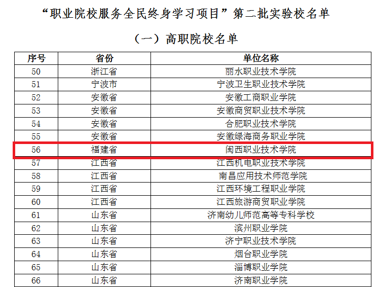 近日,中国成人教育协会公布“职业院校服务全民终身学习项目”第二批实验校名单,全国共有320所职业院校入选。其中,我校为福建唯一入选单位。