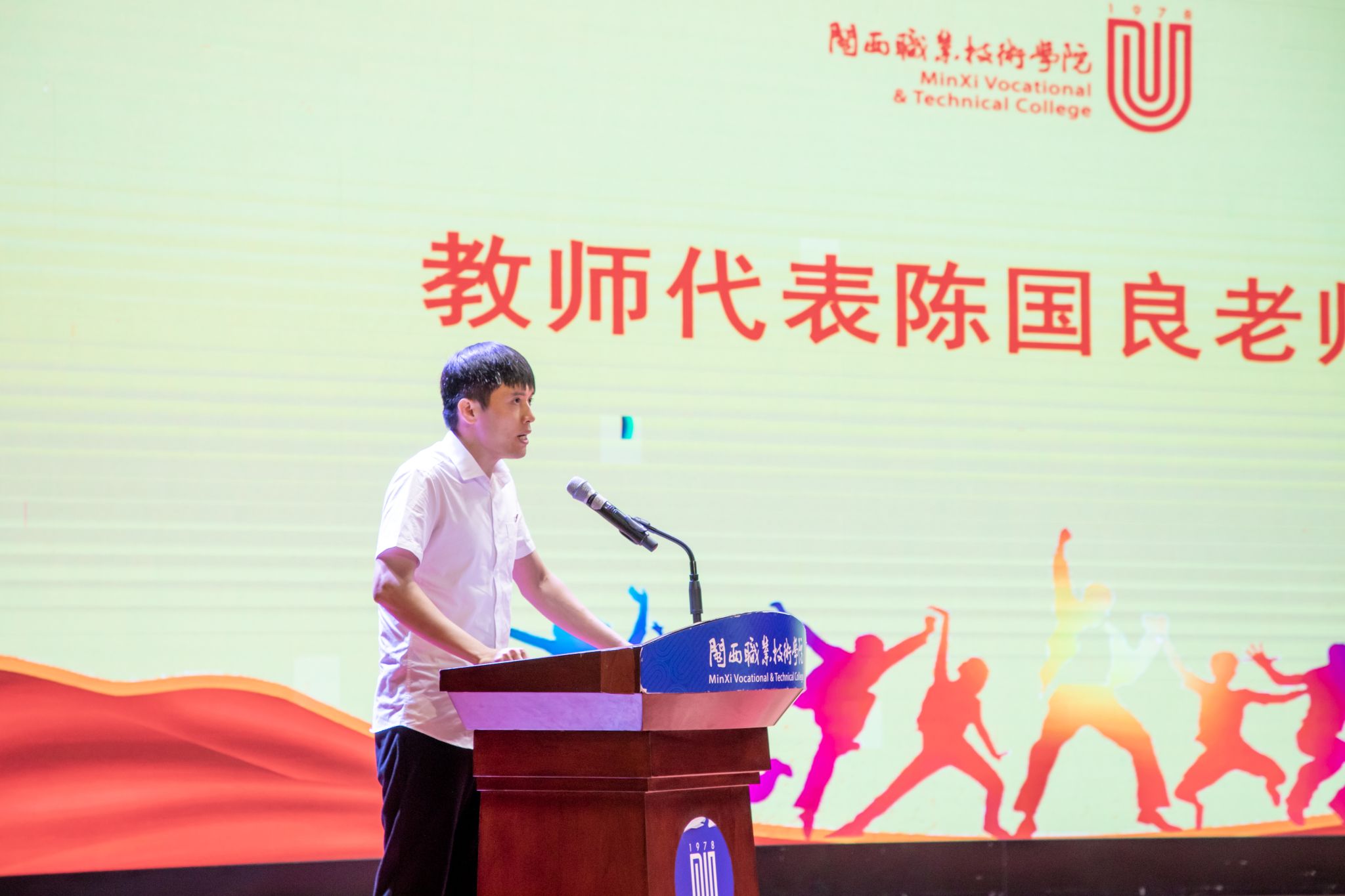 医学护理学院陈国良老师代表全体教师上台发言,在发言中表达了对同学们的眷恋、期望和祝福,勉励毕业生们在新的人生的舞台上要绘就“新画卷”、谱写“新篇章”、 构建“新格局”。