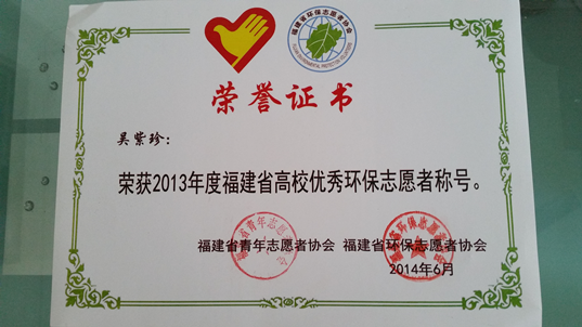 近日,福建省青年志愿者协会、福建省环保志愿者协会联合表彰2013年度省高校先进环保志愿服务团体、优秀环保志愿者、优秀环保项目。我院环保协会荣获“2013年度福建省高校先进环保志愿服务团体”称号,环保协会会长吴紫珍同学荣获“2013年度福建省高校优秀环保志愿者”称号。