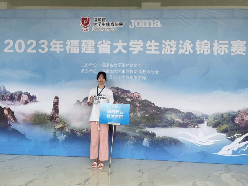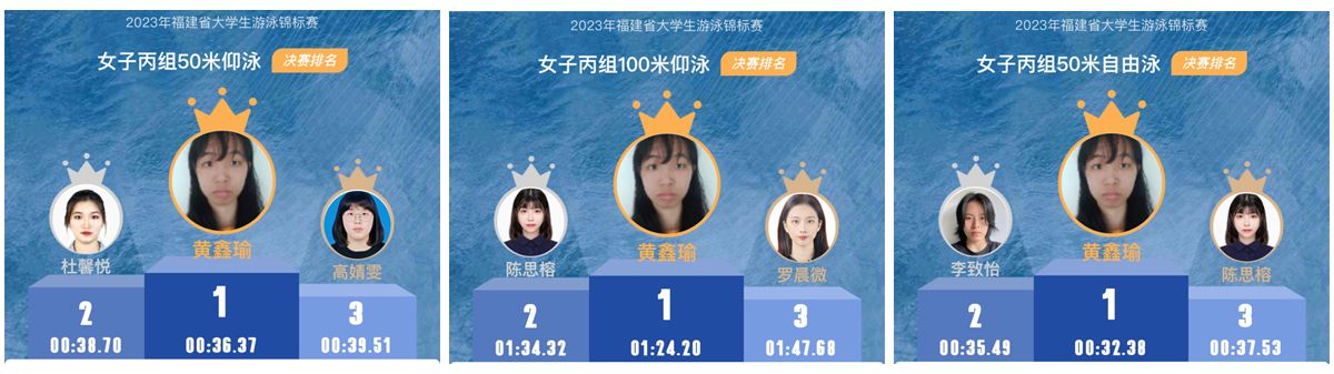 在连城举行的2023年福建省大学生游泳锦标赛上,我校选手黄鑫瑜(财经商贸学院21大数据与会计1班)、傅懿(财经商贸学院21现代物流1班)不惧强手、奋勇拼搏,取得佳绩。黄鑫瑜同学取得女子丙组50米仰泳、女子丙组100米仰泳、女子丙组50米自由泳三个赛项的金牌,傅懿同学获得男子丙组 50米蛙泳第三名、男子丙组100米蛙泳第三名、男子丙组50米蝶泳第四名。