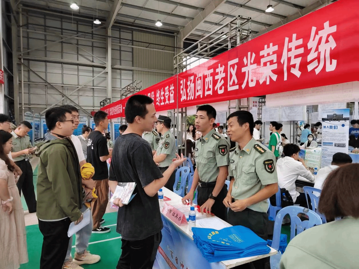 活动现场,“弘扬闽西老区光荣传统 建功军营奉献青春热血”“一人当兵 全家光荣 一次服役 终身受益”“健康人生·绿色无毒”“金融反诈进校园 诚信安全伴我行”等横幅高挂,馆内人山人海,气氛热烈。