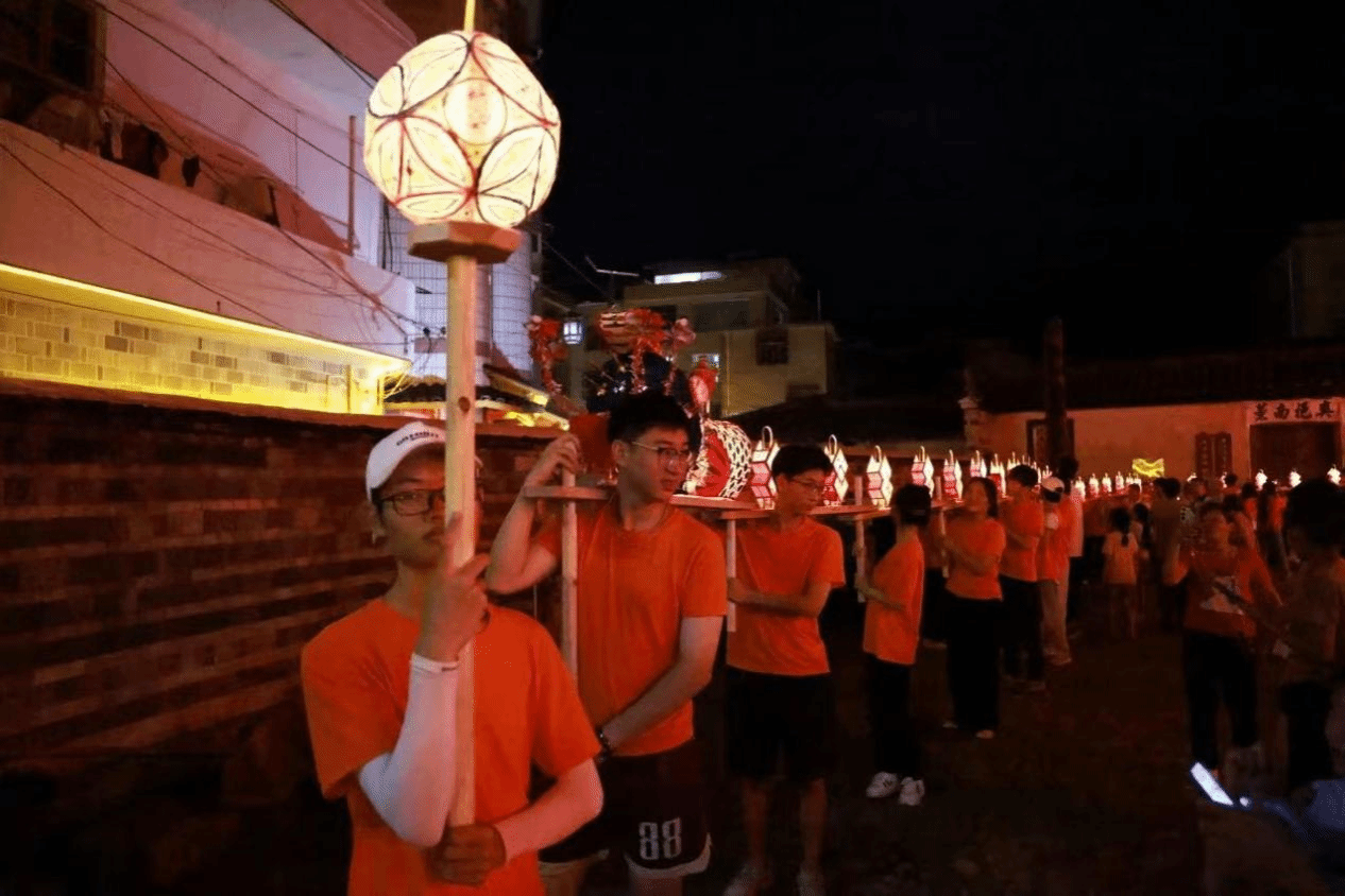 与四堡雕版印刷有深厚渊源的是四堡镇的“拔龙”。“拔龙”即“拔龙灯”、“游龙灯”、“出龙灯”,是四堡客家人正月期间一项集祭祖、娱乐、体育竞技等于一身的综合性民俗活动,主要纪念明朝末年曾任苏州仓储士清官——四堡雕版印刷业始创人邹学圣。7月7日,实践团在子仁屋动手实操体验了花灯竹框架组装、花灯宣纸绘画、花灯竹框架组装。做完花灯后,当天晚上实践团在子仁屋体验了龙岩市级非遗--连城拔龙。活动开始时,实践团以2个花灯为1组,共组装15块板凳花灯,随后将小龙头、龙尾、板凳花灯抬到雾阁村四堡中心小学门口连接成完整的一条龙,再沿龙川溪一路抬到子仁屋,重现“一夜鱼龙舞;众里寻他千百度,暮然回首,那人却在,灯火阑珊处”千年前南宋场景。当天,实践团也学习了客家十番音乐和四堡锡器的制作。