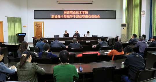 4月2日,我院在办公楼二楼会议室举行新提任中层领导干部任职廉政集体谈话会。副院长卢兆梅,纪委书记李贞鑫,纪委副书记柯德明及新提任中层领导干部出席会议。会议由副院长卢兆梅主持。