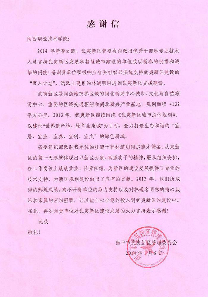 日前,南平市武夷新区管理委员会寄来感谢信,感谢无码人妻AV一二区二区三区选派建筑工程系专业教师林道明同志支援武夷新区建设。信中说:“省委组织部派驻我单位的挂职干部林道明同志德才兼备,从来新区的第一天起就体现出以新区为家、真抓实干的精神,服从组织安排,在工作岗位上兢兢业业、任劳任怨,为新区的建设发展提供了专业的技术支持,为新区规划建设做出了应有的贡献。2013年,我们所取得的辉煌成绩,离不开贵单位的鼎力支持以及对林道明同志的精心栽培和家属的密切照顾,让其能全心全意的投入到武夷新区的建设中。在此,再次对贵单位对武夷新区建设发展的大力支持表示感谢!”