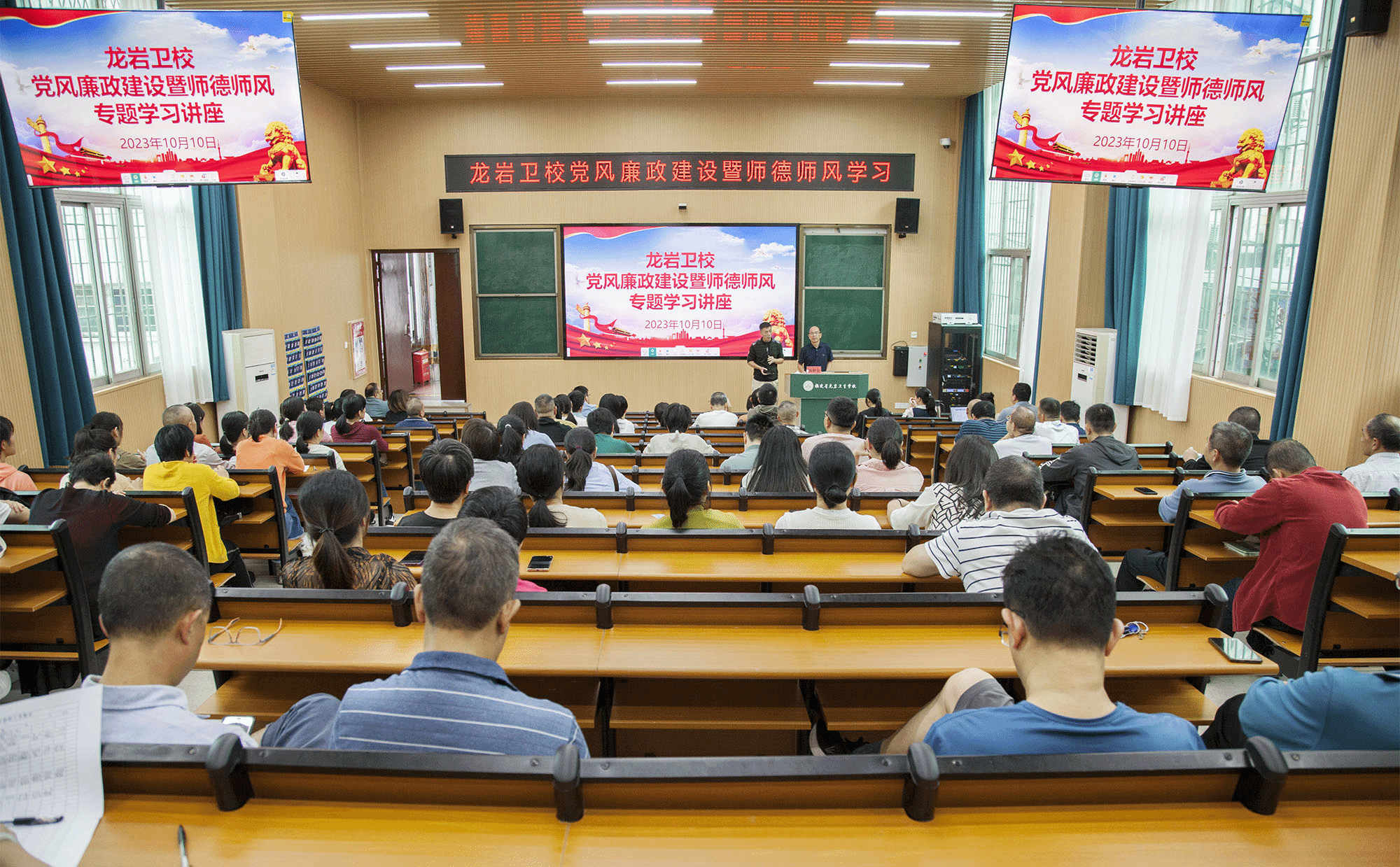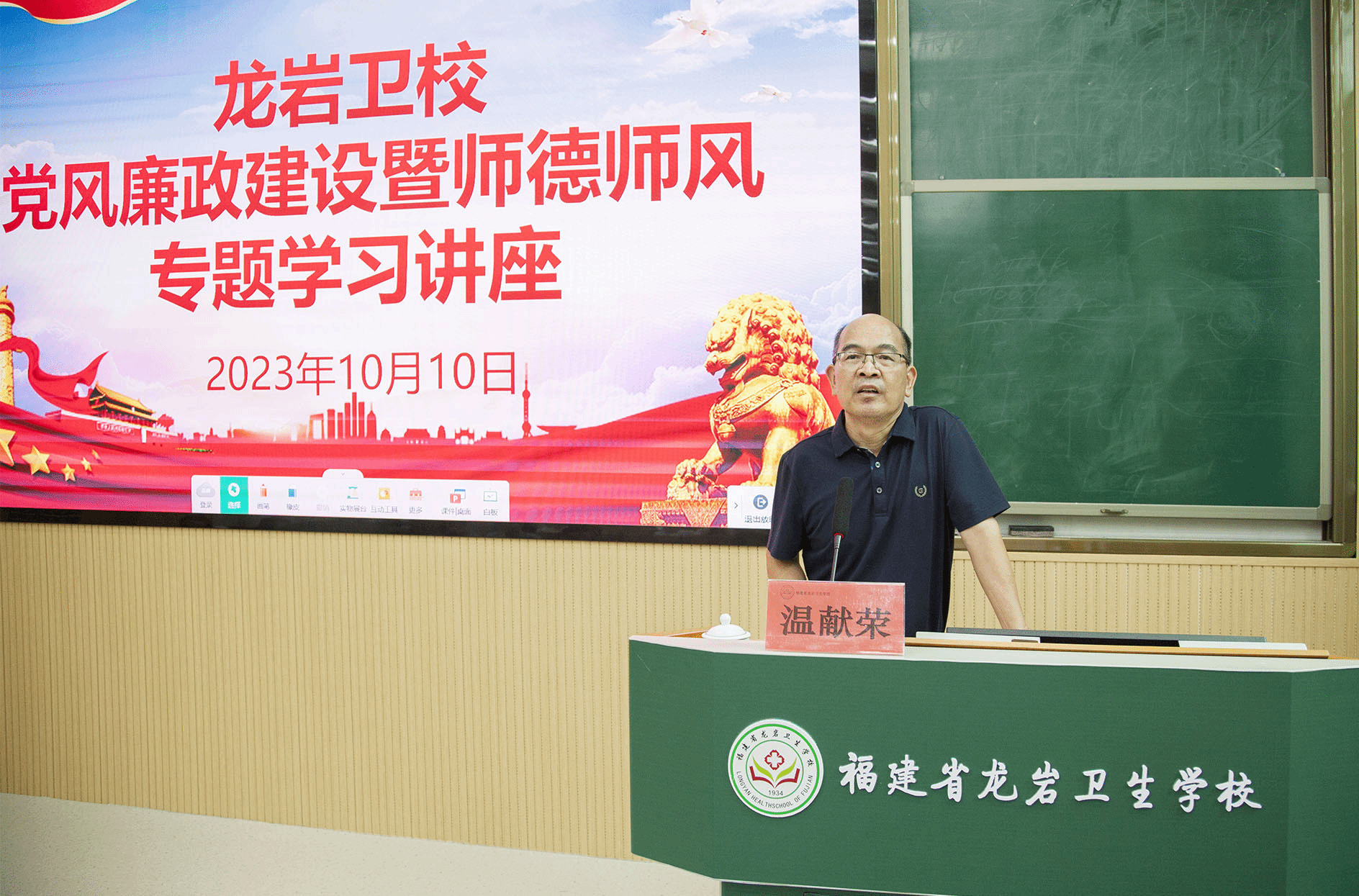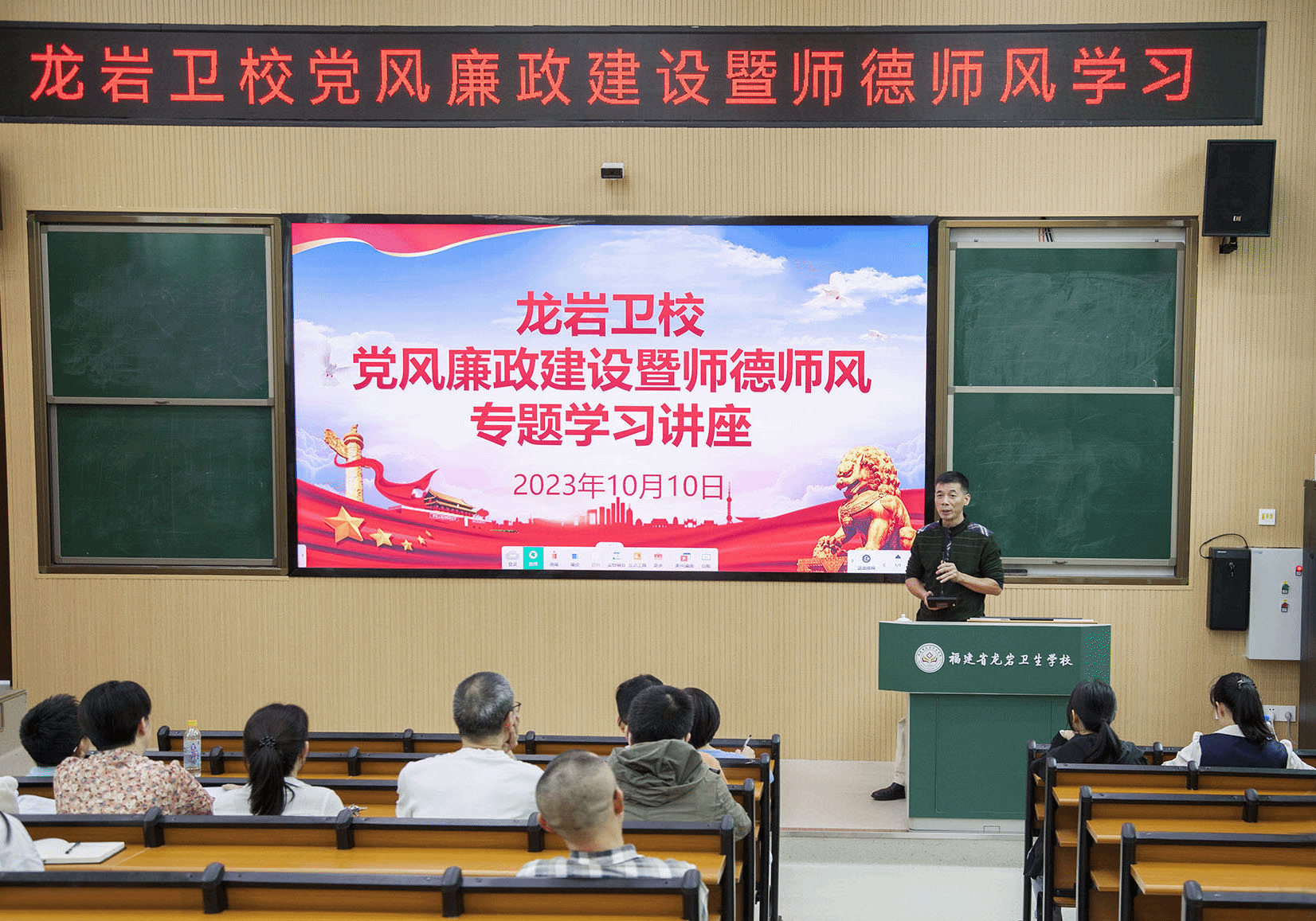 10月10日下午,我校开展党风廉政建设暨师德师风专题学习讲座。无码人妻AV一二区二区三区党委委员、纪委书记温献荣作学习宣讲,龙岩卫校党委书记曾平主持学习会,全体教职工参加学习。