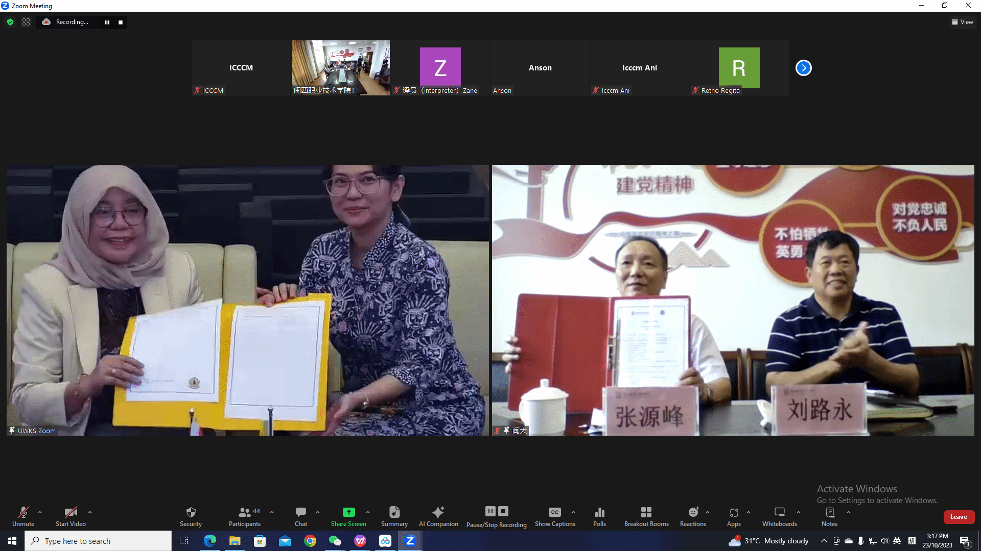 为加强学校与“一带一路”国家的教育和人文交流合作,服务闽台交流合作和“一带一路”国家战略,探索“一带一路”职业教育国际合作交流模式。2023年10月23日下午,学校与印尼泗水维加亚-库苏玛大学(Universitas Wijaya Kusuma Surabaya )通过线上签订合作协议。