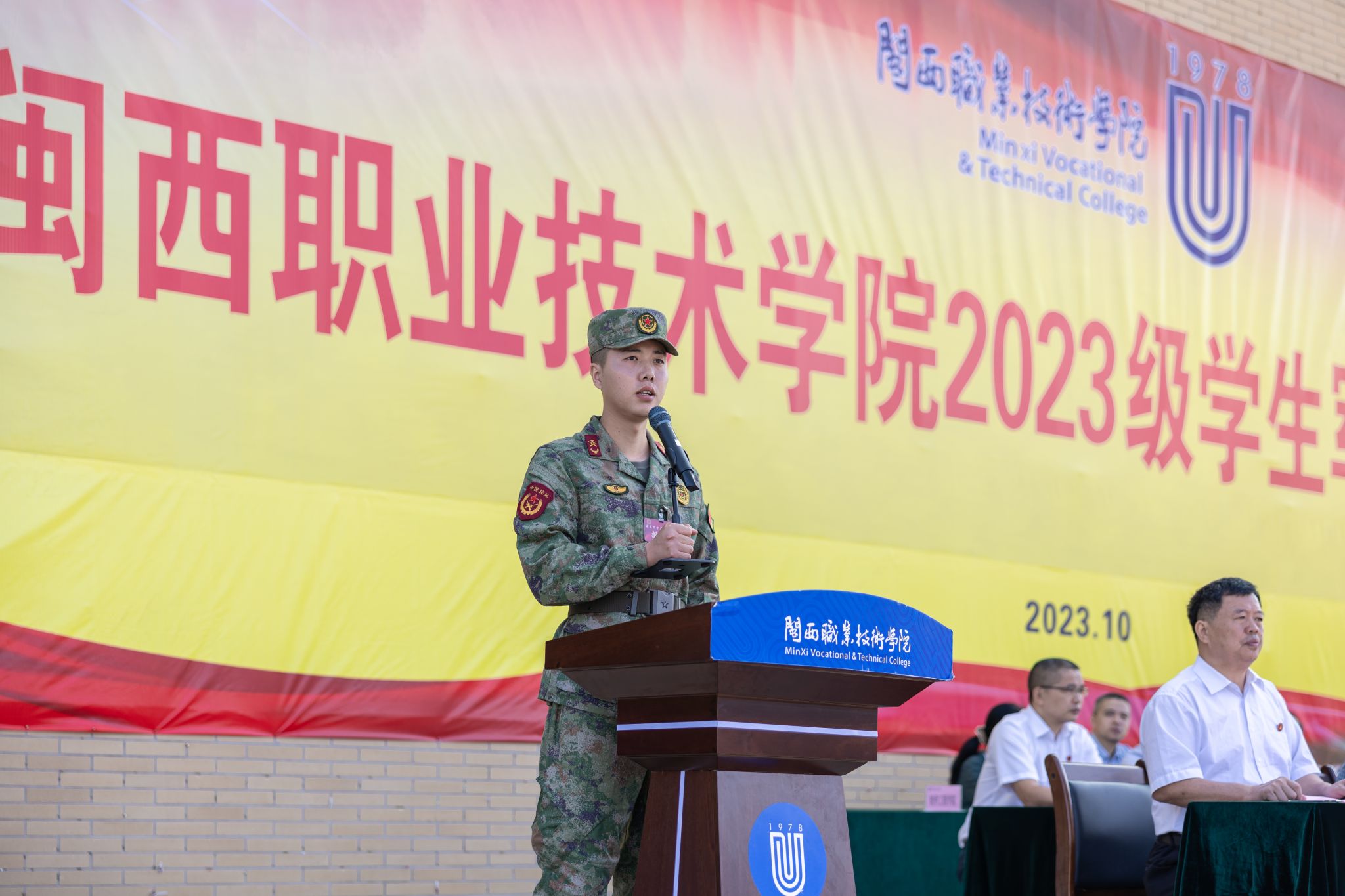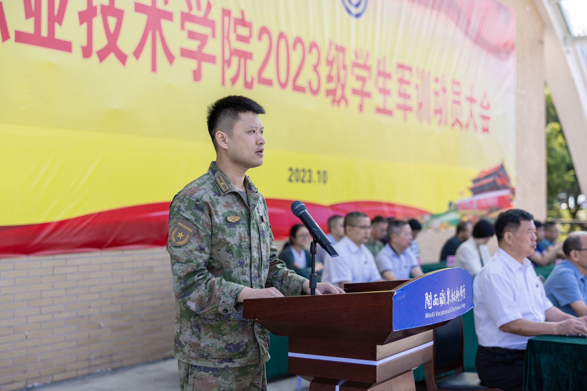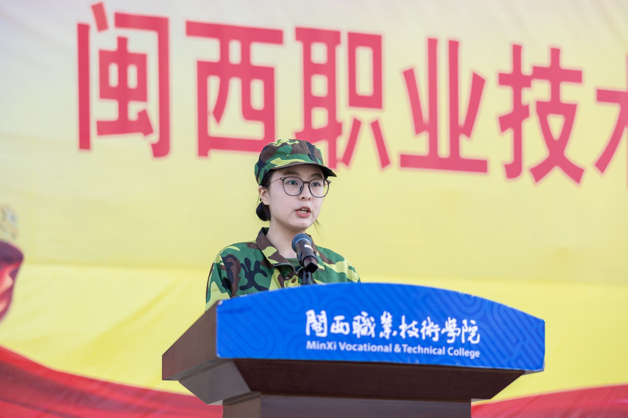 新生代表陈铠琳同学发言,她代表23级新生向领导和教官们问好,并表明克服困难坚决完成军训任务的决心。