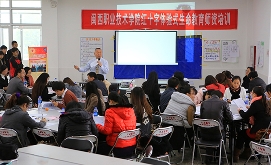 会后,来永旭为大家作为期一天的体验式生命教育培训。他从分析红十字体验式生命教育的工作背景、红十字体验式生命教育体系的理论构建、项目开发和课程设计等方面,阐述了从团队引导实践出发,开展以结果为导向的体验教育,构建体验-认知-理论-展示(EATS)的授课模式。整场培训课气氛轻松、活跃,案例丰富,内容新颖,既加深受培训老师对体验式生命教育的理解,又调动受培训老师推动开展红十字相关工作的积极性和创造性。
