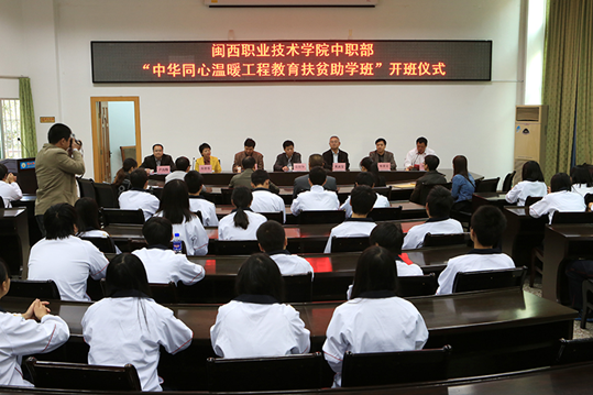 11月26日下午,无码人妻AV一二区二区三区“中华同心温暖工程教育扶贫助学班”开班仪式在行政楼二楼会议室举行。福建省中华职业教育社党组成员、副主任彭钦华,福建省中华职业教育社办公室主任邓宪安,龙岩市委统战部副部长、调研员、龙岩市中华职业教育社主任郑景文,龙岩市中华职业教育社副主任朱碧蓉,学院院长来永宝,副院长刘路永、卢兆梅,中专部负责人、教师代表、学生家长代表、助学班全体学生等近70人参加开班仪式。开班仪式由副院长刘路永主持。