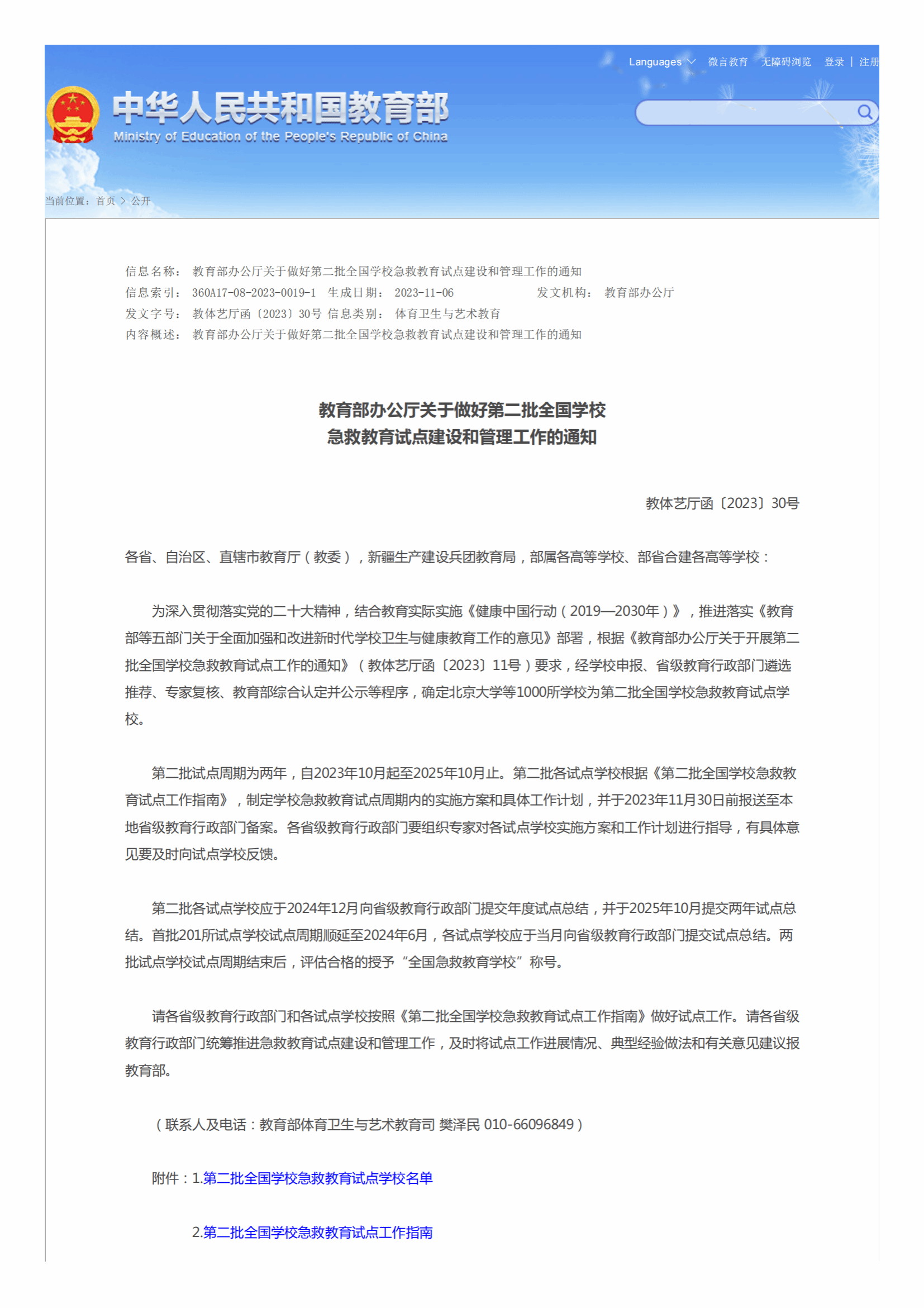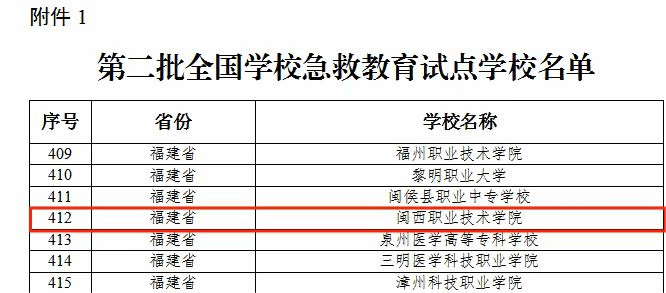 为深入贯彻落实党的二十大精神,落实《教育部等五部门关于全面加强和改进新时代学校卫生与健康教育工作的意见》,深入实施青少年急救教育行动计划。医学护理学院在现有急救实训设备和师资的基础上,积极组织申报,经省级教育行政部门遴选推荐、专家复核、教育部综合认定并公示等程序,2023年11月我校入选为第二批全国1000所学校急救教育试点学校。