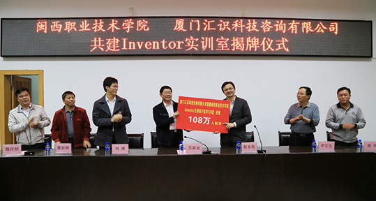 仪式上,厦门汇识科技咨询有限公司赠送Autodesk公司的Inventor正版设计软件135套(价值108万元)予我院,副院长吴新业和总经理陈旭东共同为Inventor实训室揭牌。