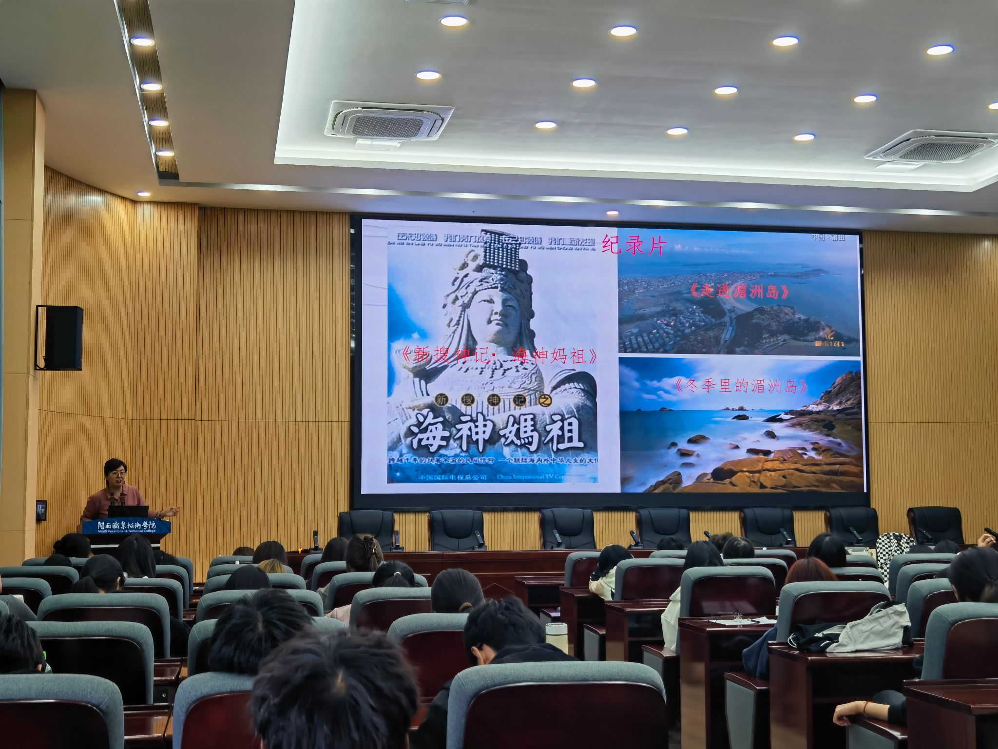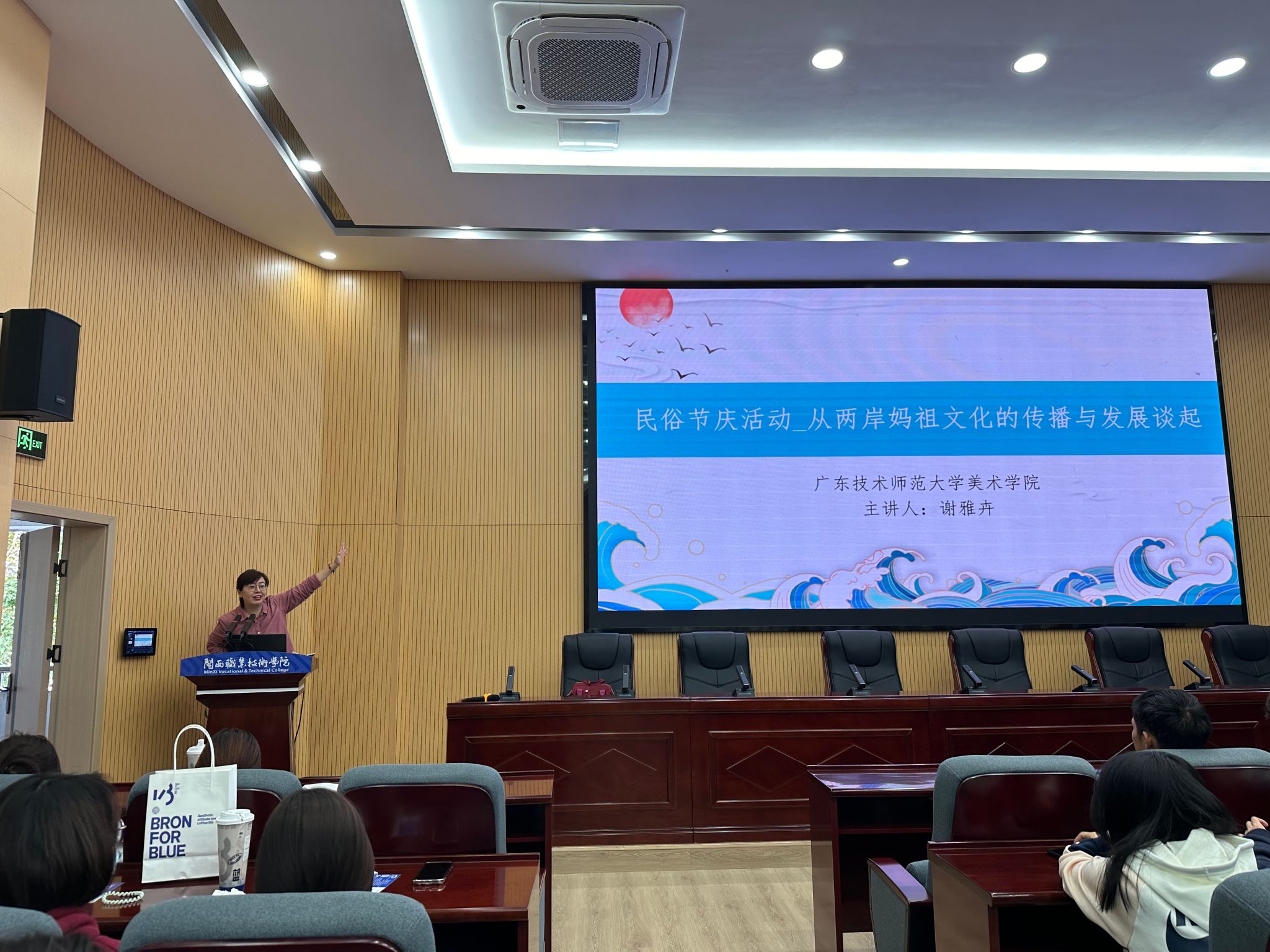 谢雅卉博士从“妈祖文化的缘起与发展”“21世纪海上丝绸之路的传播概念”“两岸妈祖文化的信仰圈传播现象(台湾、中国大陆)”入手,讲述了内地到宝岛台湾两岸妈祖的形象演变、文化传播的发展和地域性的特色演变。谢雅卉博士通过自身的田野调查和详细的案例,介绍了如何从妈祖文化中提取到影视、饮食、伴手礼、节庆活动、新媒体的ip运用等,让师生们学习到了妈祖文化在文创产品的设计和文旅活动的活化,更感受到传统非遗文化与今天现代生活的有效融合。讲座以闽台共同的文化为桥梁,观点思路独到,让人眼前一亮,也让师生感受到了两岸一衣带水,同根同源的关系,