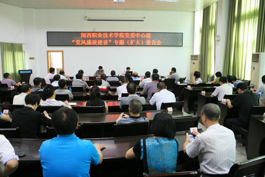 10月11日上午,院党委理论学习中心组举行“党风廉政建设”专题(扩大)报告会。院领导马春延、来永宝、吴新业、刘路永、卢兆梅、李贞鑫、张斯为,院长助理李伟闽,全体中层领导干部、各党总支纪检委员等近百人出席听取了报告。龙岩市纪委副书记沈觉新应邀到校作专题报告。专题报告会由纪委书记李贞鑫主持。