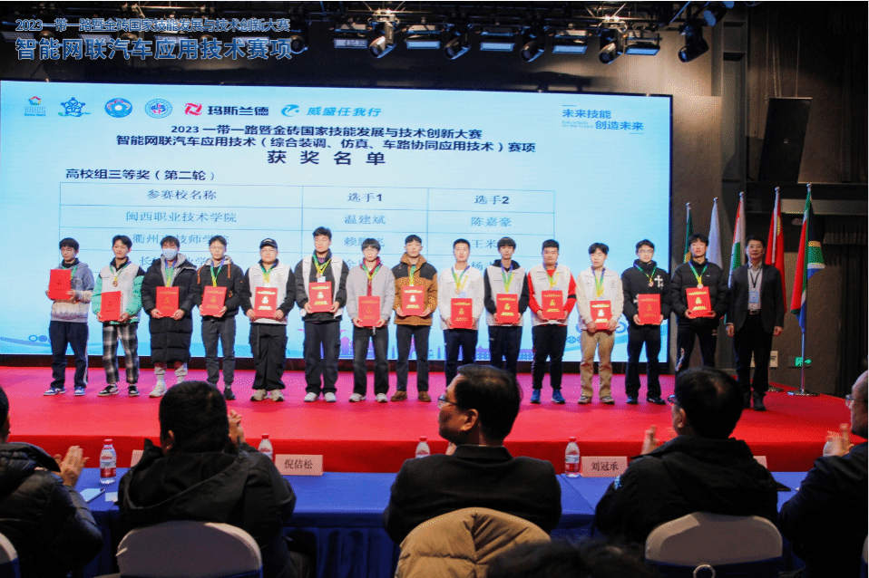 12月14日-17日,由金砖国家工商理事会中方理事会主办的2023一带一路暨金砖国家技能发展与技术创新大赛智能网联汽车应用技术赛项在上海交通职业技术学院顺利举行,来自全国的142支参赛队同台竞技。大赛设中职组、高校组和职工组三个组别,其中高校组包括高等职业院校、技师学院和本科院校,共136名选手参赛,我校智能制造学院温建斌、陈嘉豪同学荣获高校组三等奖。