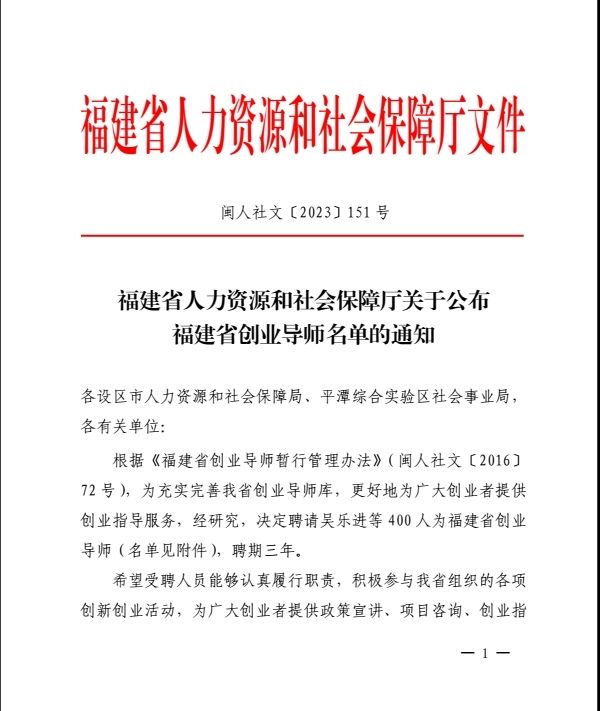 近日,福建省人力资源和社会保障厅根据《福建省创业导师暂行管理办法》(闽人社文〔2016〕72号),遴选并公布了400名福建省创业导师,我校赖松兆、林福、钟亮梅、傅生生、刘剑友、陈春福、涂海英、陈建萍、袁秀珍等9位老师入选,聘期三年。