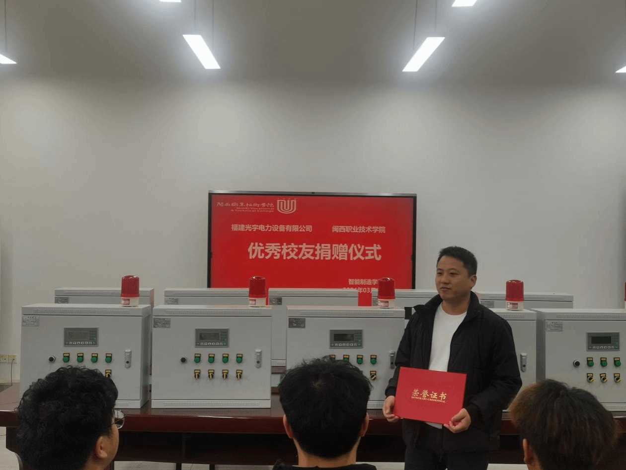 3月14日,智能制造学院与福建光宇电力设备有限公司捐赠仪式在辛耕楼216举行,福建光宇电力设备有限公司董事长、学校2005届电气自动化专业校友陈祥向智能制造学院捐赠10套电气控制柜实训设备。学院党政班子、教师代表出席捐赠仪式。