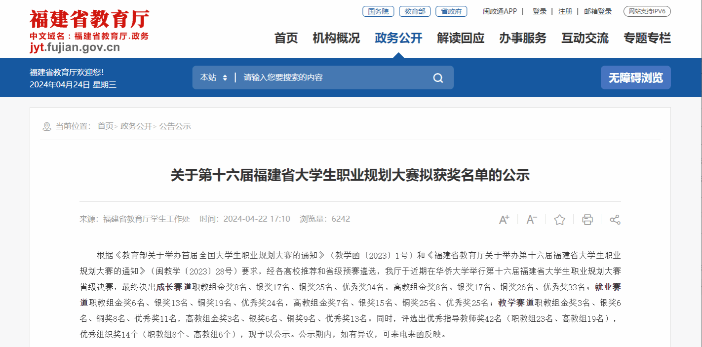 我校在由福建省教育厅主办的第十六届福建省大学生职业规划大赛中获得佳绩。本次大赛首次分设成长赛道、就业赛道、教学赛道,每个赛道分为职教组和高教组。大赛自2023年9月启动以来,全省高校师生参与度高,省内各高校根据分配名额选拔推荐,共有86所高校的302位学生和59位教师入围省级预赛。经专家评审,最终91名学生和16名教师闯入决赛。3月13日-15日,决赛在华侨大学厦门校区举行。
