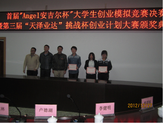 12月27日下午,由院团委和就业指导中心主办,院YBC青年创业服务站和创业爱好者联盟共同承办的学院首届“Angel安吉尔杯”大学生创业模拟竞赛决赛在行政楼二楼会议室举行。担任决赛的评委老师有:优秀创业校友(康琦环保科技有限公司常务副总)刘高威、纪检监察室副主任钟亮梅、KAB讲师曹熠城及营销专业教师陈玉章、汤亮。