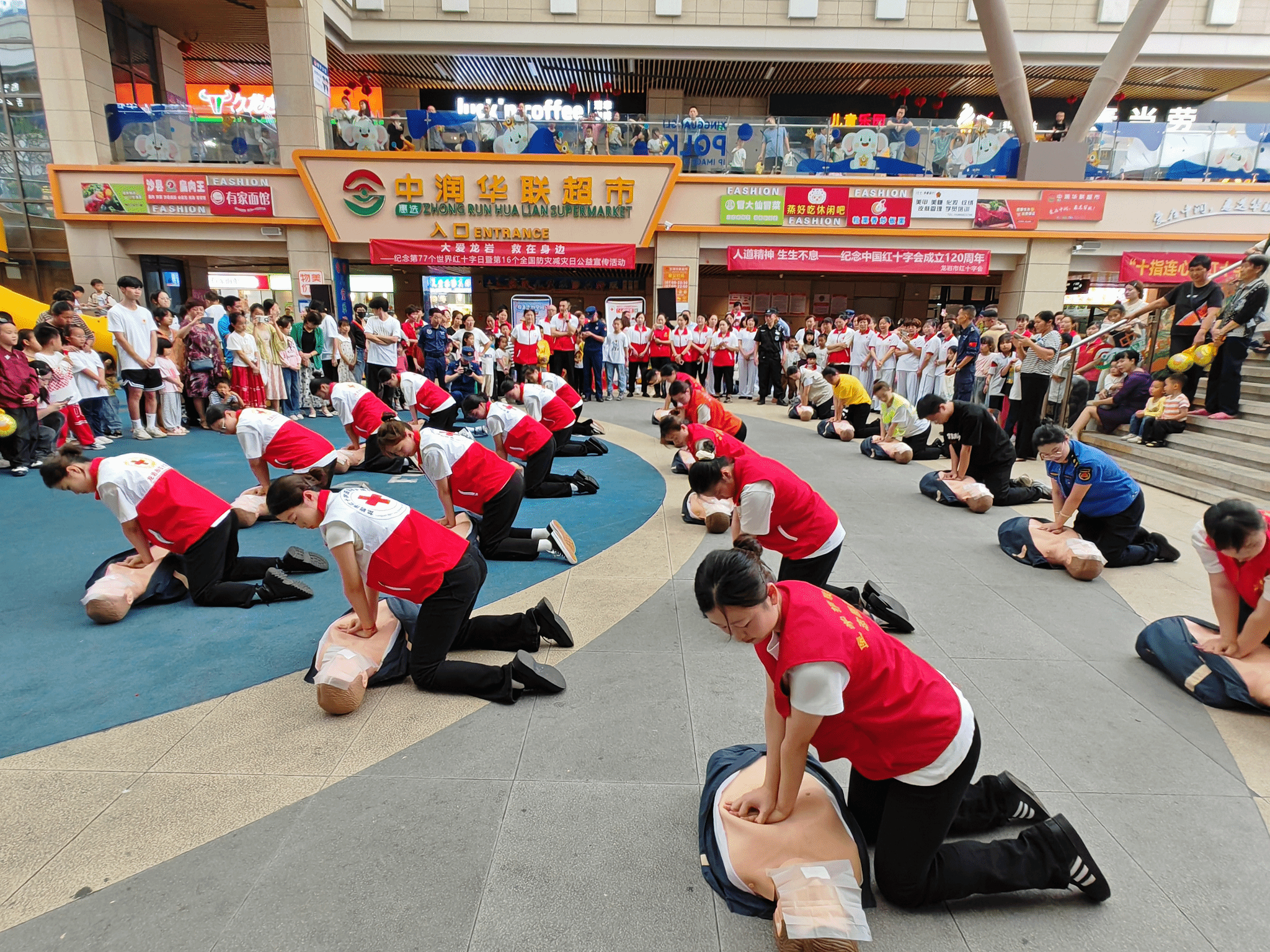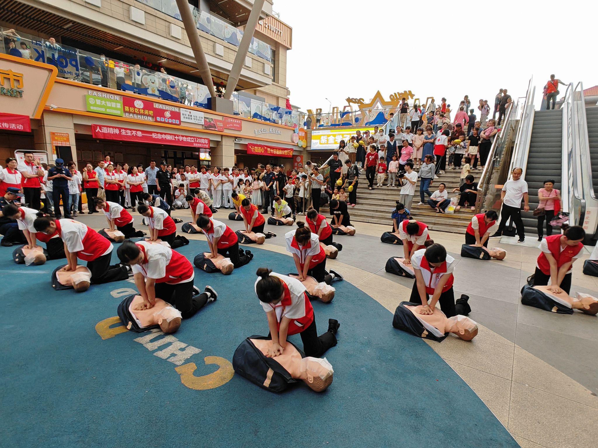 在活动现场,志愿者们通过设立宣传展板、发放宣传资料、现场演示等方式,向市民普及红十字运动基本知识、红十字法律法规以及应急救护知识。同时,志愿者们还通过快闪的形式,为市民带来了一场精彩纷呈的应急救护技能展示。我校22名学生模拟不同行业从业人员,身着不同行业服装,整齐划一地进行了心肺复苏集体演示,将活动推向高潮,赢得了现场观众的阵阵掌声。