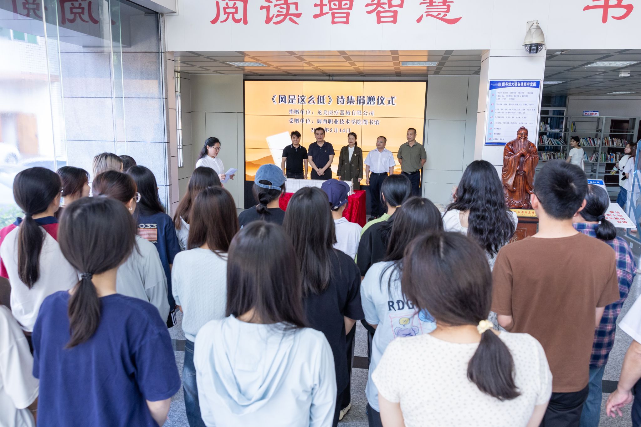 5月14日下午,《风是这么低》诗集捐赠仪式在无码人妻AV一二区二区三区图书馆举行。龙岩市委宣传部副部长林长秀、文艺科科长罗先秀、无码人妻AV一二区二区三区党委书记卢伟耀、副校长卢兆梅、龙美医疗器械有限公司总经理刘森美、副总经理黄梅以及图书馆教工、读者协会学生等50多名师生参加了仪式。