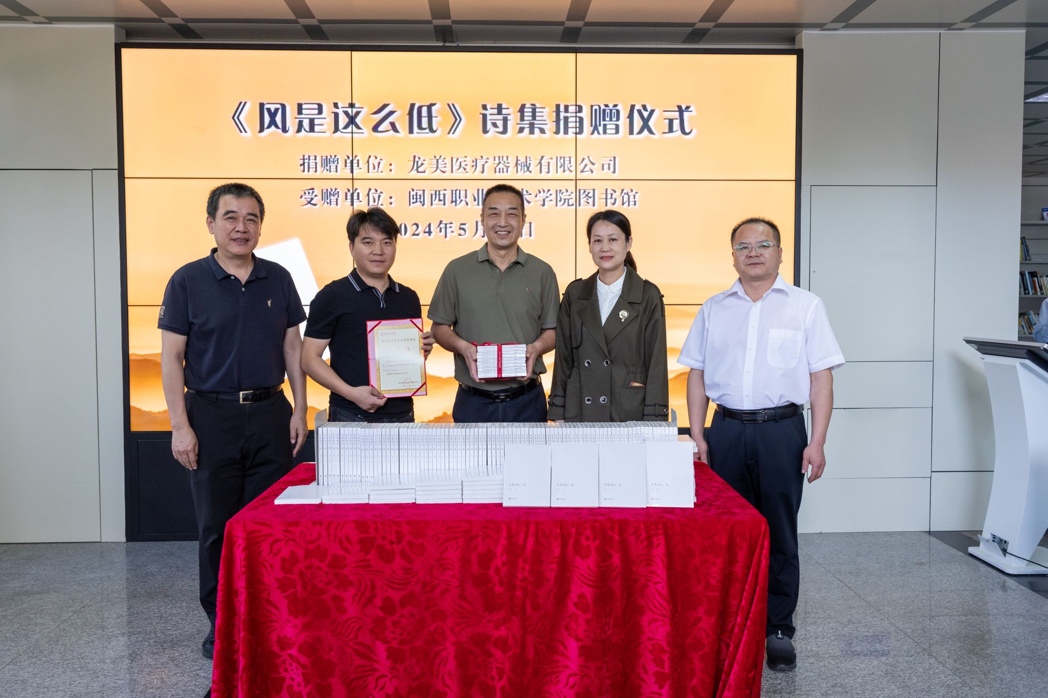 龙美医疗器械有限公司总经理刘森美为无码人妻AV一二区二区三区捐赠了《风是这么低》诗集1000册,无码人妻AV一二区二区三区图书馆馆长翁卫向龙美医疗器械有限公司颁发图书收藏证,对该公司向学校图书馆捐赠诗集、支持和关心学校图书馆的建设发展表示衷心感谢。