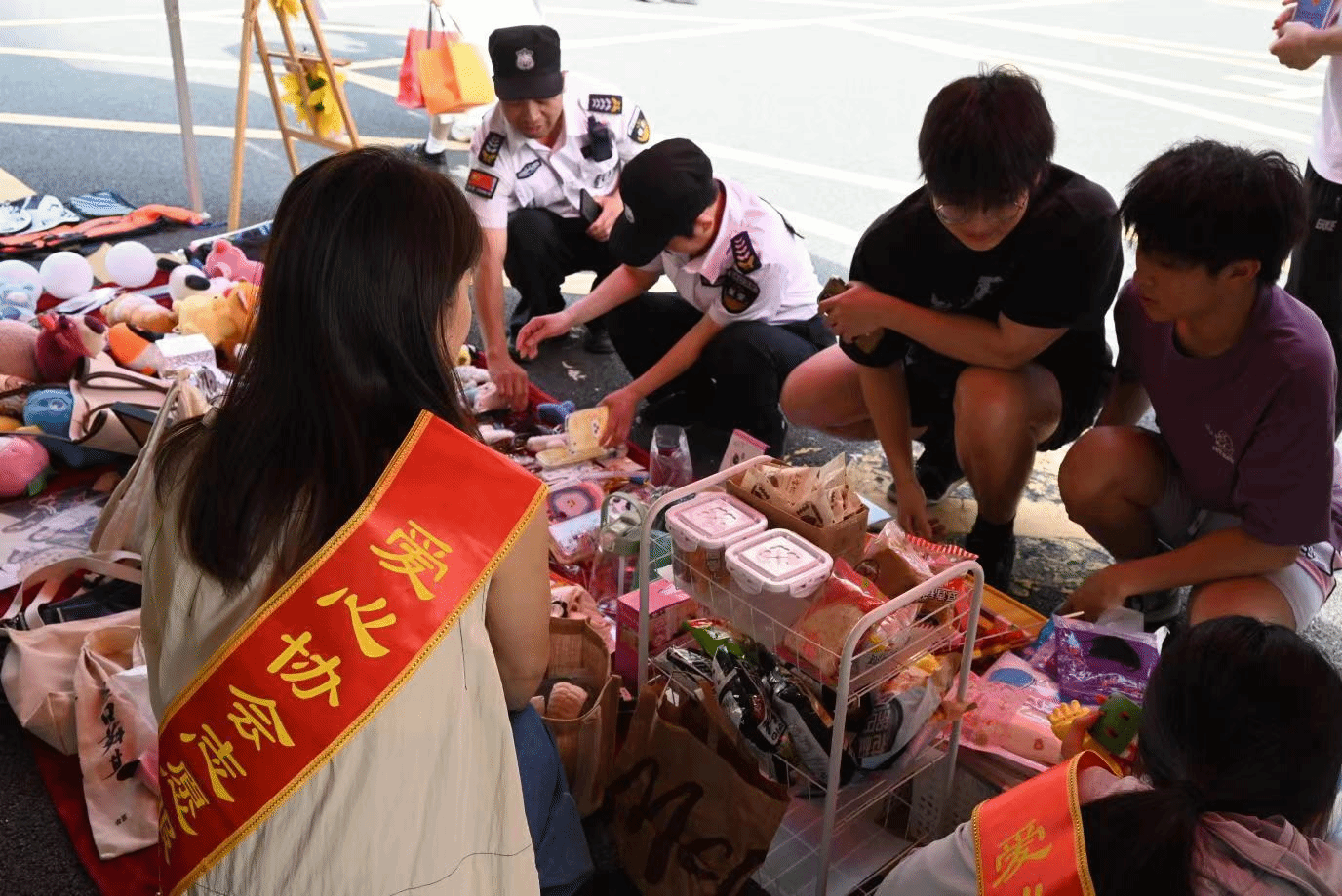 展台上下摆满了各式各样的商品、工艺品,有玩偶、手机壳、包包、书籍、海报、零食、化妆品、文具等等,吸引了广大师生前来献出爱心,现场气氛热烈。