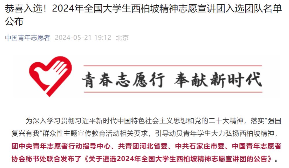 5月21日在团中央青年志愿者行动指导中心、共青团河北省委、中共石家庄市委、中国青年志愿者协会秘书处联合公布的2024年全国大学生西柏坡精神志愿宣讲团入选团队名单中,我校信息工程学院刘剑友、王文烨老师组成的闽小信志愿服务队成功入选。