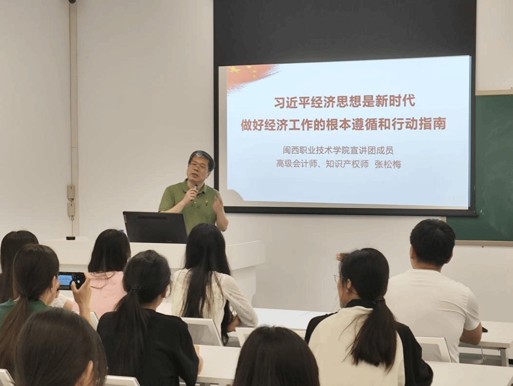 为持续深化习近平新时代中国特色社会主义思想专题宣讲,根据校党委宣传部和财经商贸学院党委的统一安排,5月23日,我校宣讲团成员、高级会计师、知识产权师张松梅到财经商贸学院开展习近平经济思想系列专题宣讲。